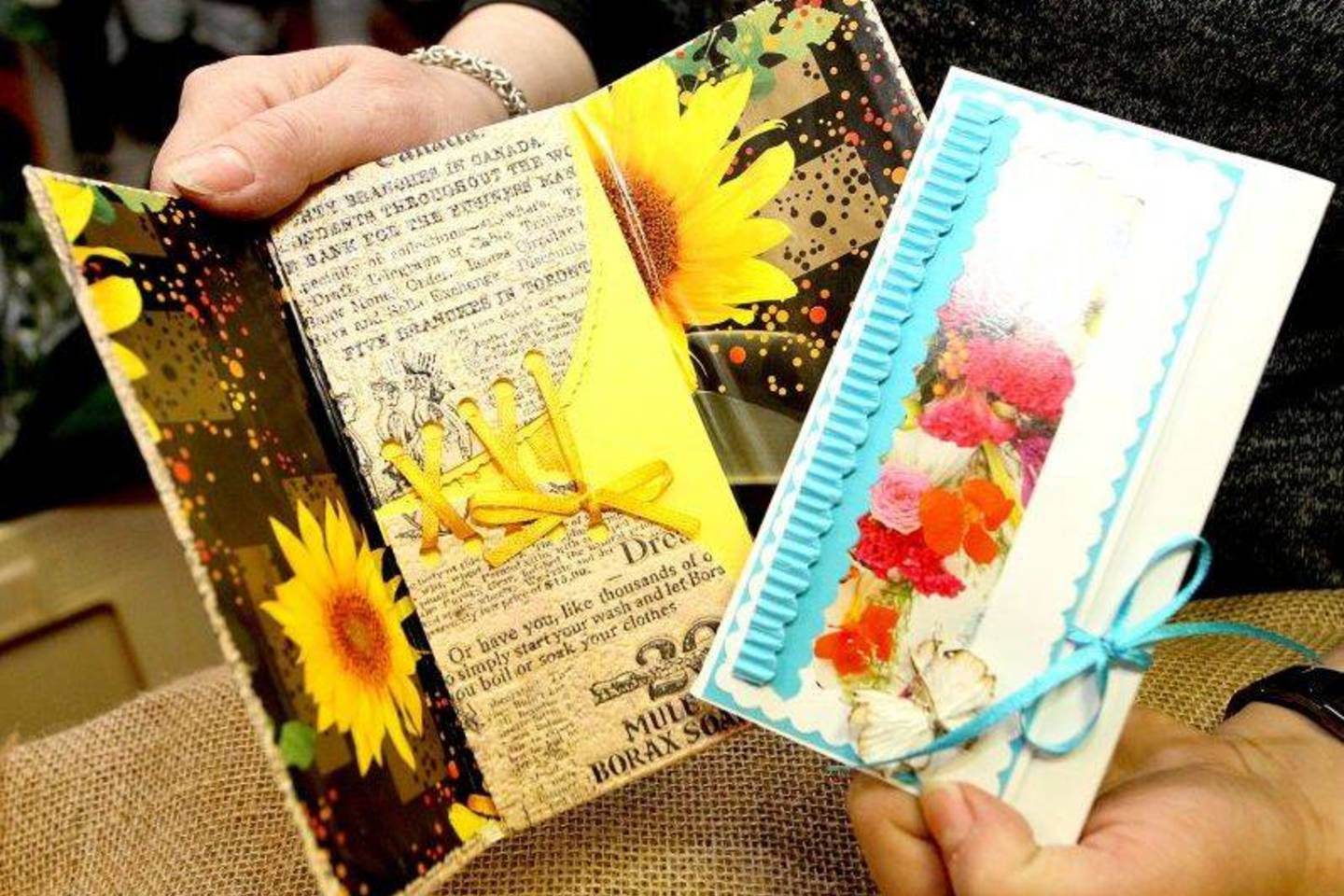 Gėlininkė rodo, nuo ko prasidėjo kelias į verslą: rankų darbo atvirukai ir įdomiai apipavidalinti vokeliai. Jiems nereikėję daug išlaidų, tik išmonės. Rankdarbiams naudojo putplastį, blizgučius, spalvotas juosteles, net žurnalų iliustracijas ir karpinius iš senų atvirukų.