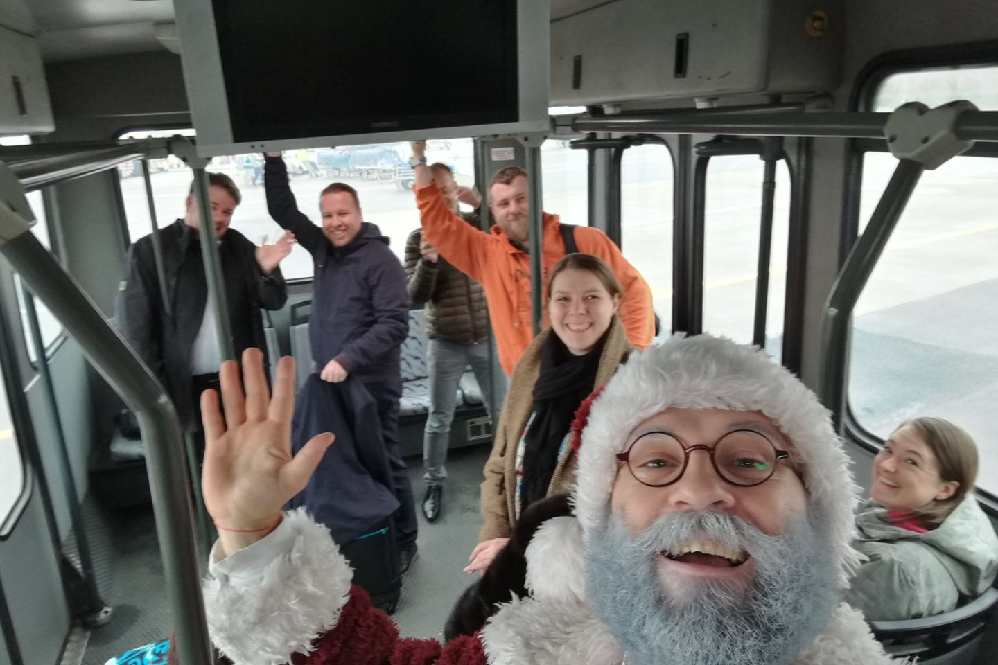 Į darbą vykstantis Senelis Kalėda sulaukia ir suaugusiųjų dėmesio – šie mojuoja, automobiliui sustojus prie šviesoforo, fotografuoja ar prašo įrašyti vaizdo sveikinimą jų vaikams.