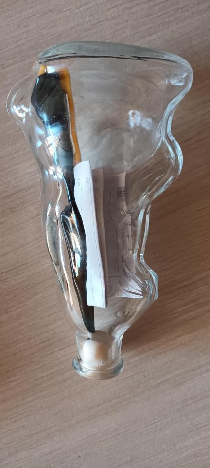 Pagaliau iškrapščius stipriai susuktą laiškelį paaiškėjo, kad jis parašytas vokiškai. Laimingas sutapimas, kad dėstytoja puikiai moka šią kalbą. „Butelių paštas“ (vok. Flaschenpost) Baltijos jūra iškeliavo 2025 m. balandžio 28 d., nes raštelis parašytas ant būtent tos dienos iš darbo kalendoriaus išplėšto lapo, o data apibraukta.