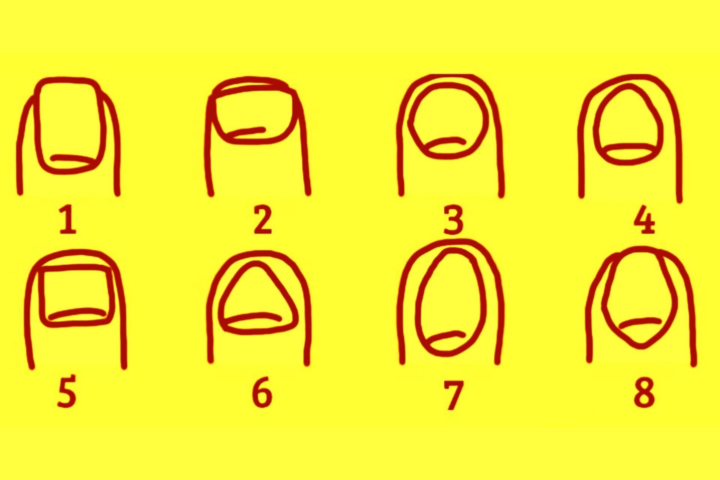Jeigu turite tokius nagus, greičiausiai esate labai bendraujantis žmogus, taip pat pasižymintis ir proto aštrumu. Jūs patiriate malonumą iš naujų pažinčių ir džiaugiatės naujomis patirtimis, taip pat mėgstate plėsti savo akiratį.