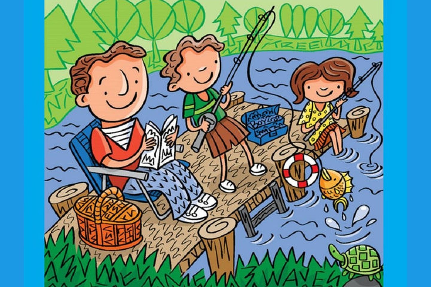 Tėtis skaito laikraštį, o du vaikai šalia jo meškerioja. Tačiau piešinėlyje yra paslėpti 6 angliški žodžiai – visi atostogų tema.