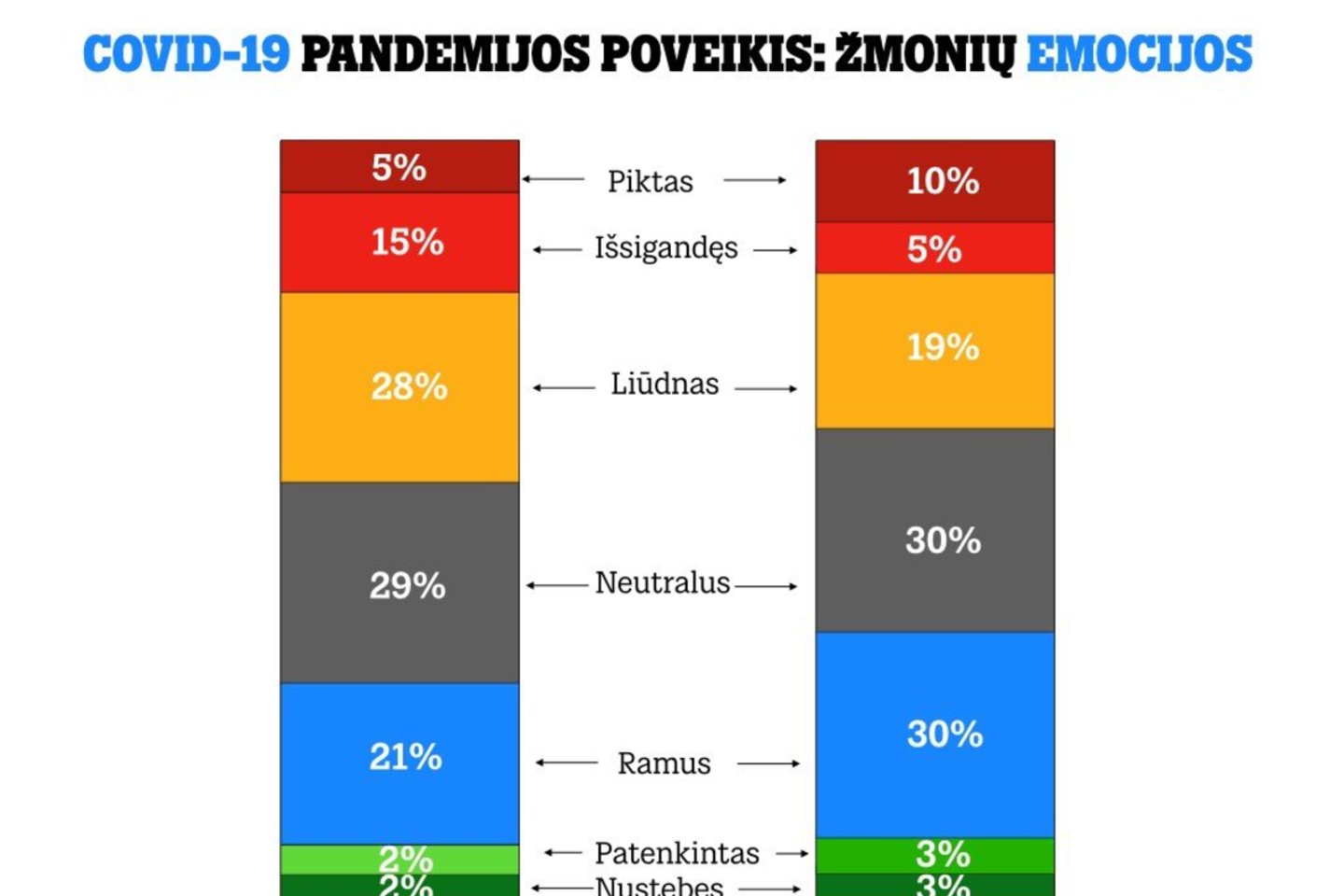Tuo tarpu išsigandusių skaičius sumažėjo 10 proc. – nuo 15 proc. balandį iki 5 proc. gegužę (iš jų 3 proc. vyrų ir 8 proc. moterų). Apklaustieji nurodė, kad dažniau juos gąsdina su sveikata susiję aspektai: grėsmė artimųjų sveikatai, viruso plitimo mastas ir tai, kad vis dar nėra vakcinos.