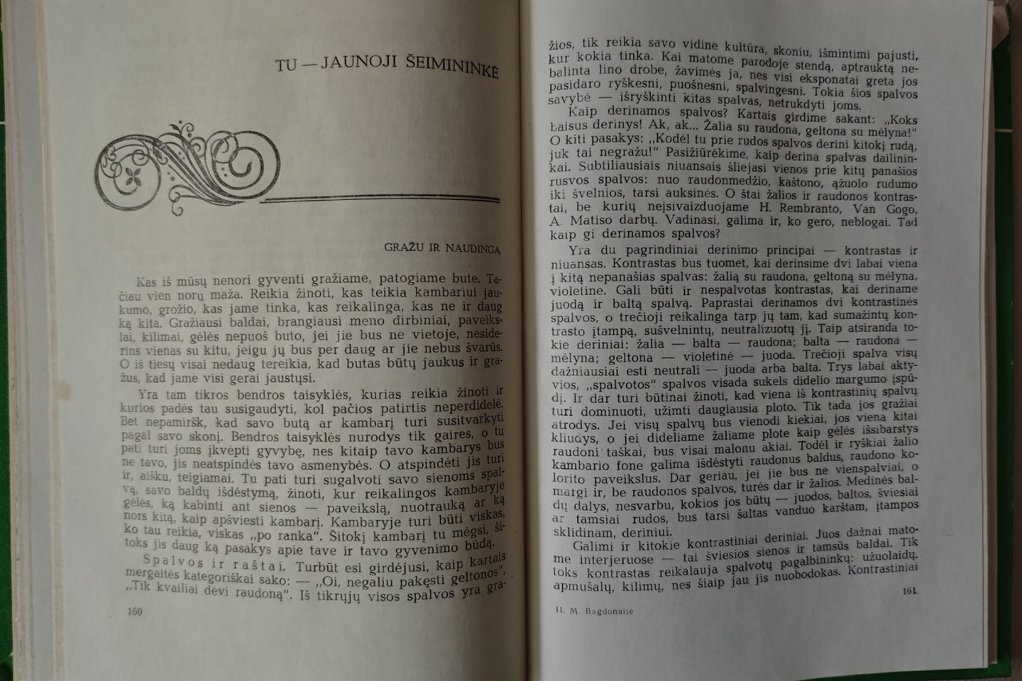 „Jei mokykloje, gamykloje, fermoje ar kitur dirbdama pavargai, tai nebus nieko geriau, kaip, grįžus namo, pasiimti rankdarbį. (Žinoma, prieš tai papietavai, susitvarkei, apžiūrėjai, ar neliko neplautų indų, nenušluostyto stalo, prilaistytų grindų, gal reikia išnešti šiukšles ar išdulkinti kilimėlį už durų.)“