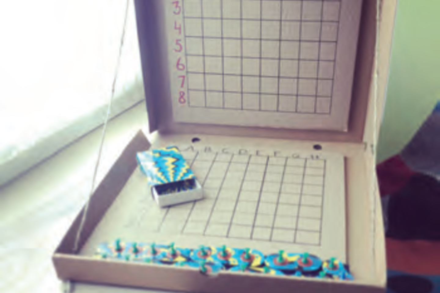 Nemažai popieriaus reikės norint pasigaminti ir jau nuo 1900 metų žmones masinantį laivų mūšio žaidimą. Visų pirma, suklijuokite dviejų picų dėžių pagrindus vieną su kitu naudojant klijus. Iš kartono iškirpkite keturis, kiek mažesnius nei picų dėžių pagrindai kvadratinius lakštus. Juos subraižykite 8 eilutėmis vertikaliai ir horizontaliai. Vertikalias eilutes sužymėkite skaičiais nuo 1 iki 8, horizontalias – nuo A iki H. Paruoštus lakštus priklijuokite prie picų dėžių, o laivelius atstos taip pat pasigaminti smeigtukais sužymėti (vienas smeigtukas atitinka vieną langelį) kartoniniai stačiakampiai ir kvadratai: 2 vnt. po 4 smeigtukus; 4 vnt. – po 3; 6 vnt. – po 2, 8 vnt. – po 1.