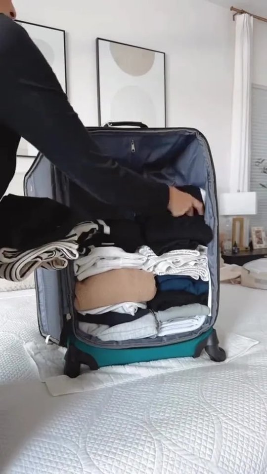 Trumpame vaizdo įraše, kuris surinko 8,6 mln. peržiūrų, mados ir kelionių influencerė pastatė tuščią lagaminą ant lovos ir supakavo jį iš apačios į viršų.