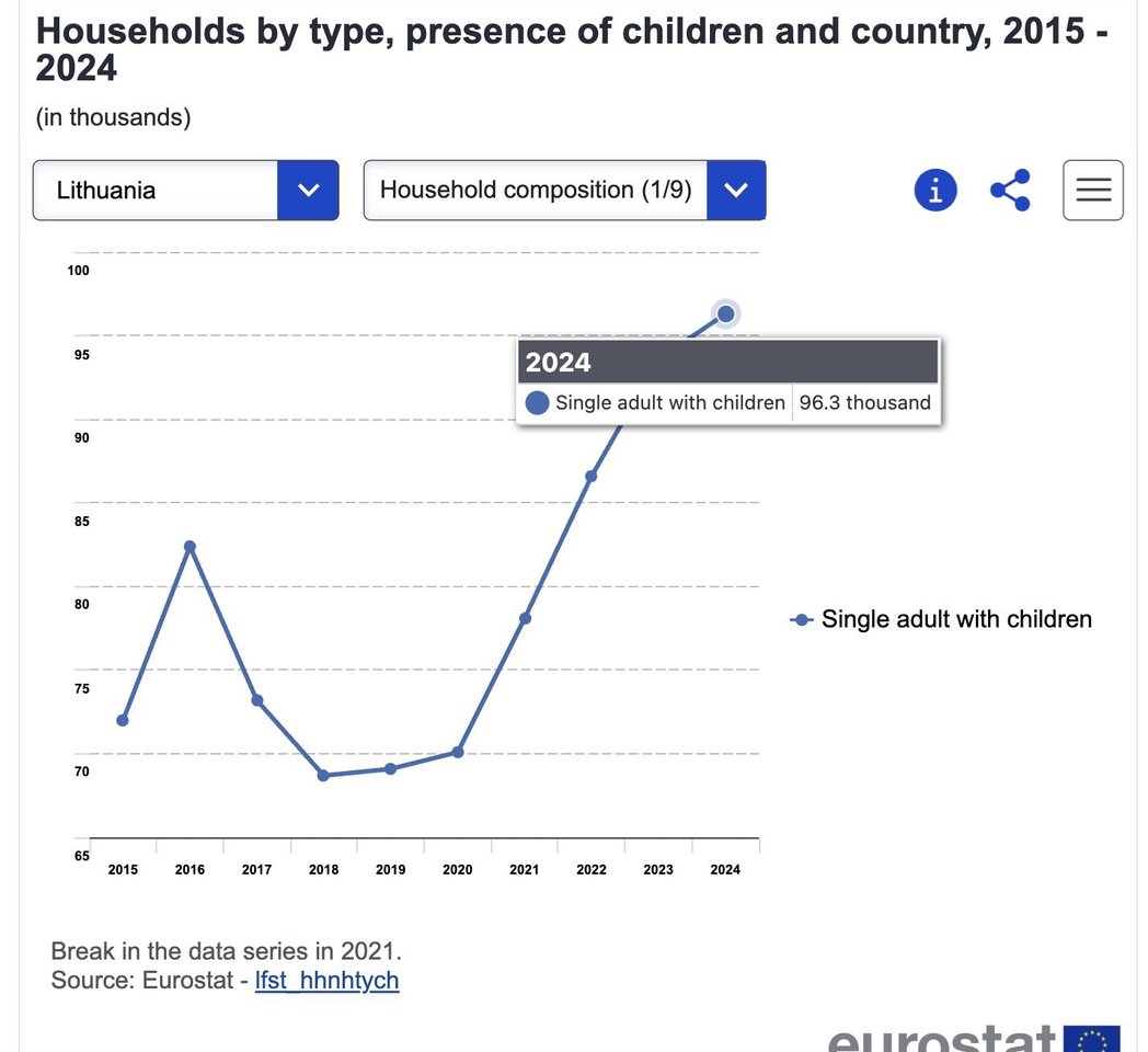 Kita vertus, pasak dr. R. Latinytės, yra dar viena priežastis, dėl kurios vaikų šeimose gimsta mažiau nei galbūt norėtųsi. Europos Sąjungos statistikos tarnybos duomenimis, 2021 m. vienišų tėvų (dažniausiai – mamų) šeimos Lietuvoje sudaro apie 25 proc. visų namų ūkių, kuriuose auginama vaikų, ir šis skaičius kasmet auga. Kas antroje besiskiriančioje šeimoje auga nepilnamečiai vaikai. Europoje ir JAV apie du trečdalius skyrybų inicijuoja moterys ir šį sprendimą prieš tai gerai apgalvoja. Vienišumo jausmas, patiriamas dar būnant santuokoje – vienas iš svarbių faktorių.
