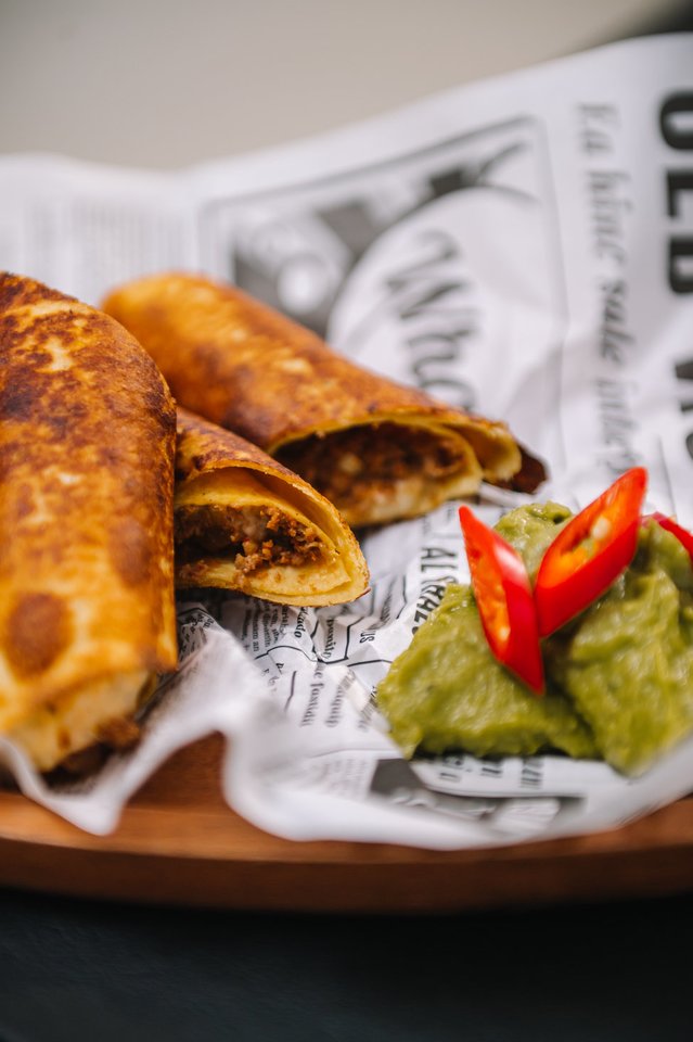Įkaitinkite keptuvę ant vidutinės ugnies. Suberkite smulkintą svogūną ir kepinkite 2–3 minutes, kol suminkštės. Sudėkite maltą jautieną ir kepkite pamaišydami, kol apskrus. Į jautieną įmaišykite smulkintą česnaką, svogūną, maltą ir rūkytą papriką, aitriąją papriką, druską ir pipirus. Sudėkite pomidorų pastą, išmaišykite ir kepinkite dar minutę. Tuomet supilkite trintus pomidorus ir vandenį. Troškinkite 8–10 minučių, kol masė sutirštės ir taps sultinga, bet ne skysta. Nukelkite nuo ugnies ir leiskite šiek tiek atvėsti. Atskirai sumaišykite tarkuotą mocarelą su majonezu, kad masė būtų tolygi ir kremiška. Ant kiekvienos tortilijos dėkite po 2–3 šaukštus jautienos įdaro ir paskirstykite dalį sūrio bei majonezo mišinio. Tortiliją tvirtai susukite į ritinėlį. Puode arba gilioje keptuvėje įkaitinkite aliejų iki 170–180 °C ir apkepkite tortilijas iš kiekvienos pusės, kol taps auksinės ir traškios. Išėmus iš keptuvės, nusausinkite jas ant popierinio rankšluosčio. Padažui į trintuvą sudėkite avokadą, petražoles, česnaką, citrinos sultis, alyvuogių aliejų, druską ir pipirus. Įpilkite vandens ir sutrinkite iki švelnios, kremiškos konsistencijos. Tortilijas patiekite karštas su paruoštu avokadų padažu.