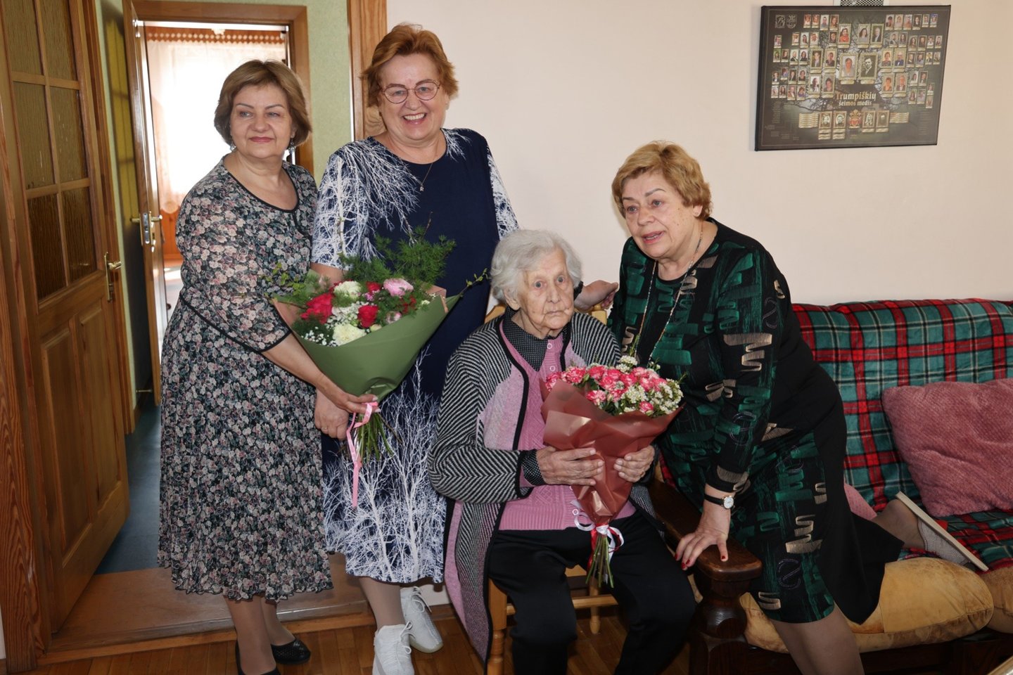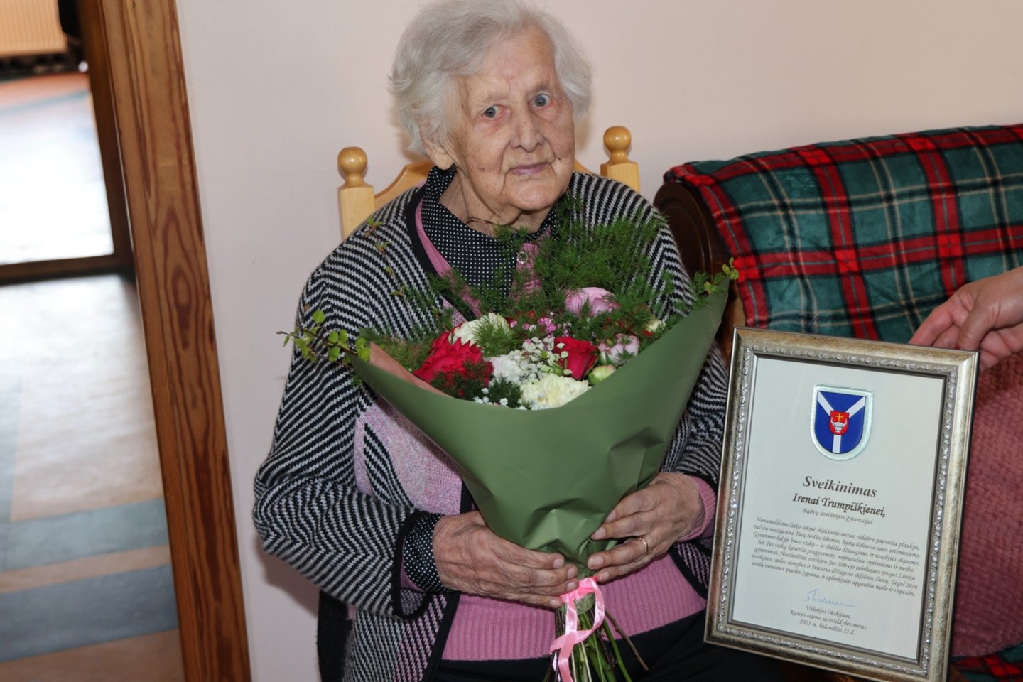 Pagerbti jubiliatės Irenos atvyko gausi Kauno rajono savivaldybės komanda: vicemeras Lukas Alsys, Socialinės paramos skyriaus vedėja Margarita Venslovienė ir Babtų seniūnas Gediminas Pupinis.