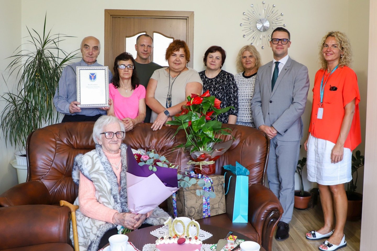 Šimtametei taip pat perduotas mero Valerijaus Makūno sveikinimas ir savivaldybės dovana – šiltas pledas.