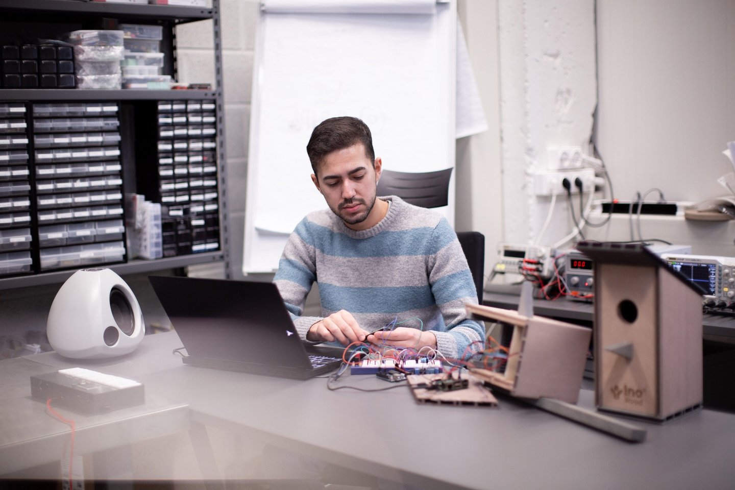 Vėliau dirbau prie išmanaus inkilo, kurį pradėjo gaminti dar prieš mane praktiką čia atlikę studentai iš Italijos. Inkile gyvena iš 3D spausdintuvu atspausdintų dalių sukonstruotas paukštis, kuris išlenda iš inkilo ir gieda, kaskart kai VGTU „LinkMenų fabriko“ paskyra Instagram platformoje sulaukia naujo sekėjo.