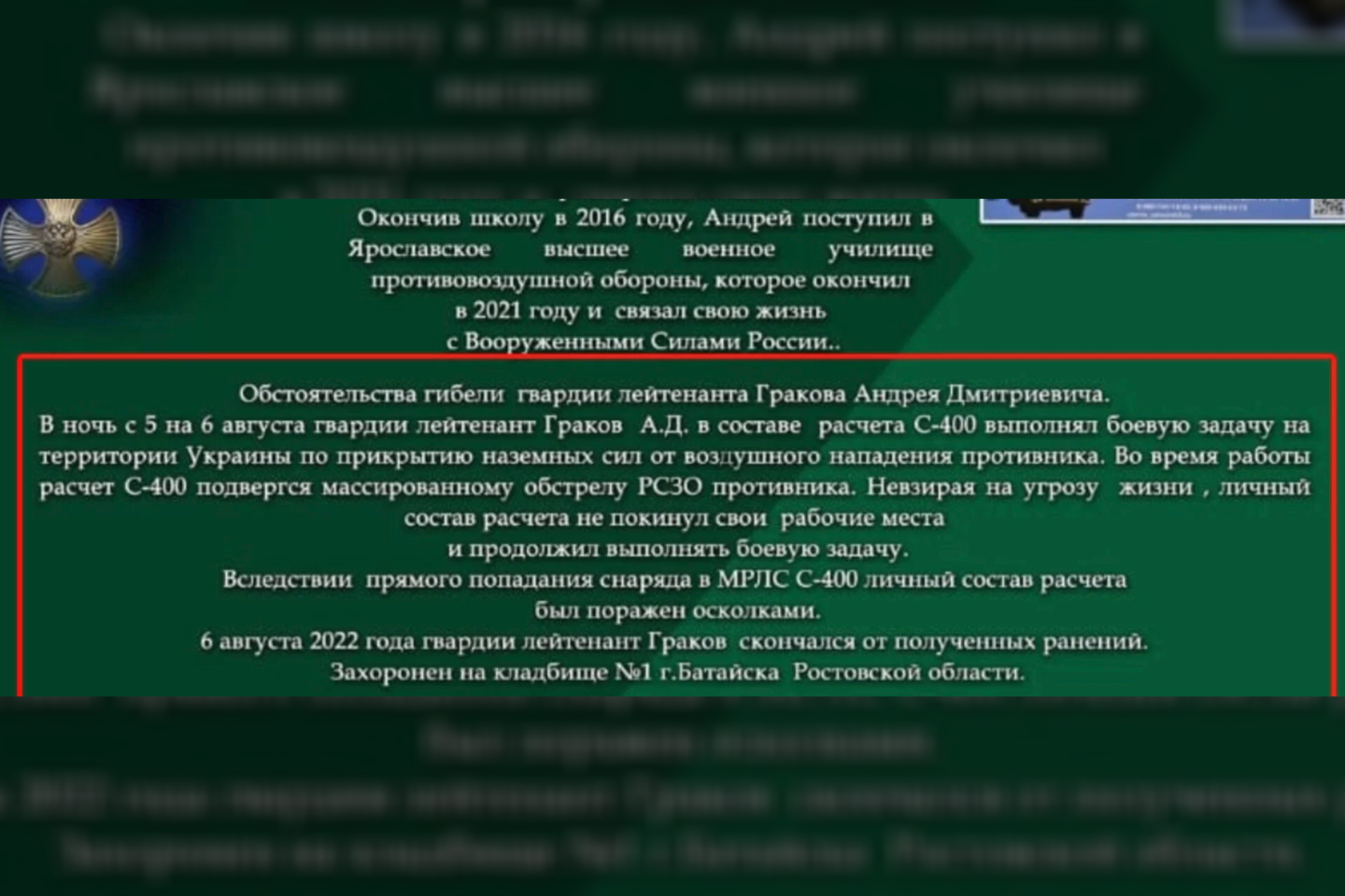 Teigiama, kad A.Grakovas buvo daugiafunkcinio radaro, kuris priklauso „S-400“ oro gynybos sistemai, brigados nariu. Mūšio metu į A.Grakovo ir jo brigados valdomą kovinę mašiną pataikė raketa.