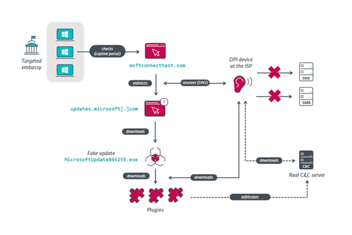 „Nors negalima visiškai paneigti, kad siekiant vykdyti AitM atakas ambasadų tinkluose buvo pažeisti maršrutizatoriai, teisėtas duomenų perėmimas Baltarusijoje leidžia manyti, kad duomenų srautas buvo keičiamas interneto paslaugų teikėjų, o ne taikinių maršrutizatorių lygmeniu“, – aiškina tyrėjas.