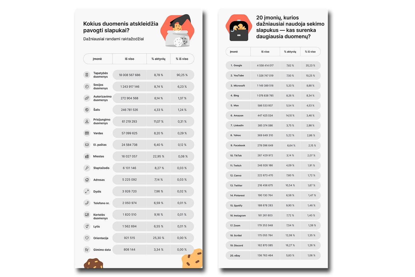 Lietuva, nors ir buvo 63 vietoje pagal pavogtų slapukų skaičių, vis tiek susidūrė su milžinišku pažeidžiamumu – aktyvūs išliko net 17 milijonai slapukų.
