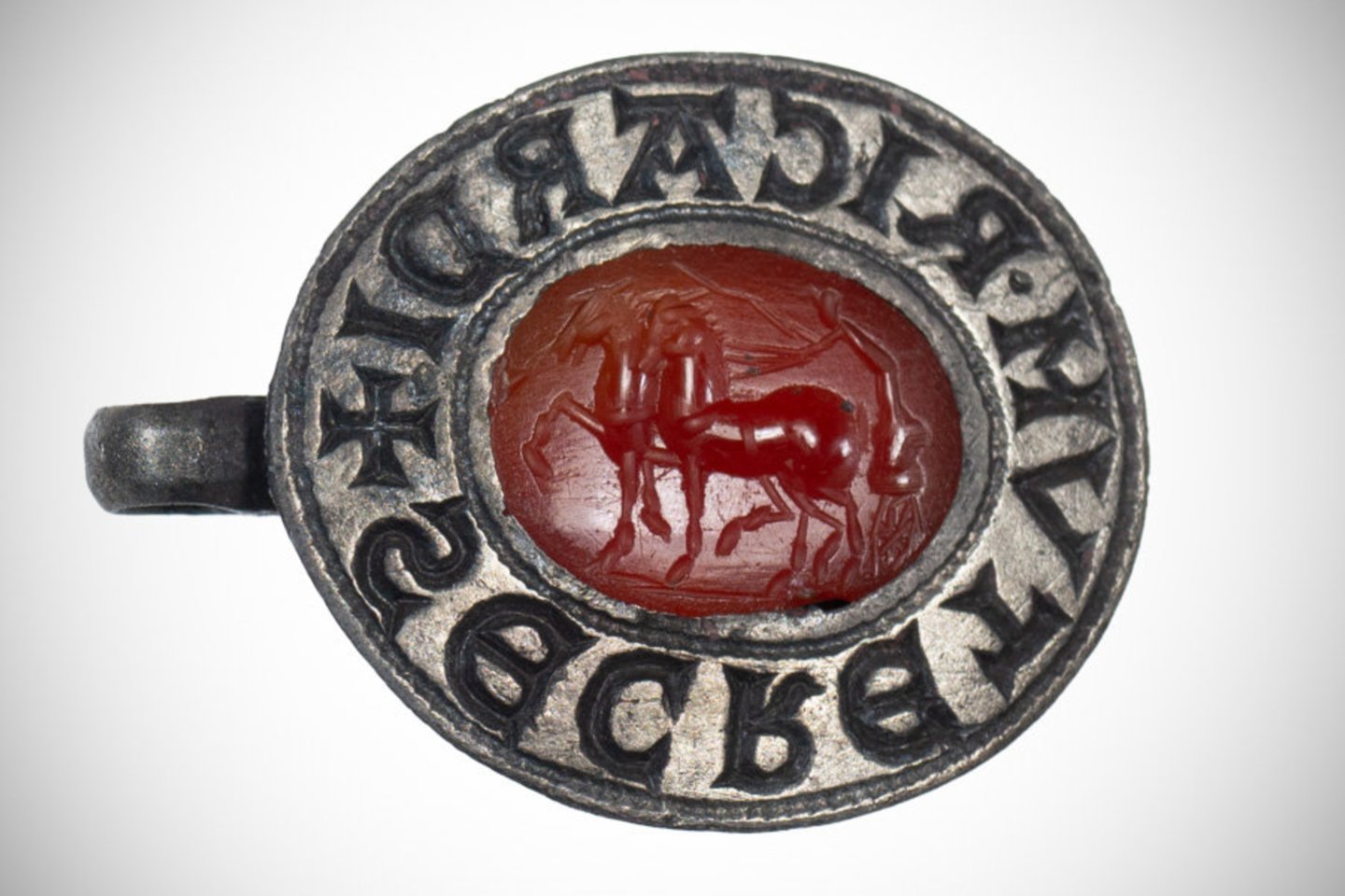 Metalo detektoriaus savininkas viduramžių antspaudą atrado 2024 m. rudenį Gosfilde, Esekso grafystėje. Tačiau neseniai Jungtinės Karalystės Kilnojamųjų senovės radinių registravimo programos ekspertai atliko antspaudo analizę ir nustatė, kad 800 metų senumo objekto centre yra 2000 metų senumo romėnų brangakmenis.