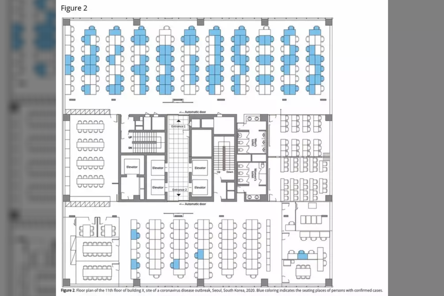 Biurai ir restoranai taip pat gali būti infekcijos taškais. COVID-19 protrūkio skambučių centre Seule (Pietų Korėjoje) tyrimas parodė, kad užsikrėtė beveik pusė vieno aukšto darbuotojų. Beveik visi jie sėdėjo toje pačioje biuro patalpos pusėje.