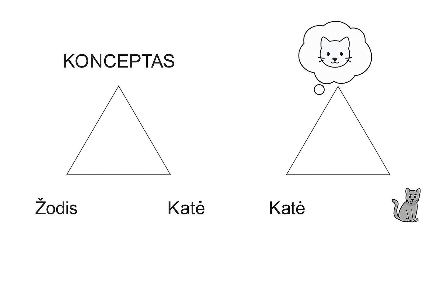 „Paprastai kalbant, žodis yra ženklas. Tai reiškia, jog fizinio pasaulio objektai, reiškiniai ar veiksmai bei juos atspindintys konceptai mūsų smegenyse yra susieti su to daikto, reiškinio ar veiksmo pavadinimu, t. y. žodžiu, užrašytu tam tikra forma. Kaip tai vyksta? Mūsų smegenys ne tik veidrodiniu principu atspindi realybėje matomą objektą – pavyzdžiui, priešais tupintį katiną – bet ir susieja tą regimą katiną su mintyse sukurto to objekto atvaizdu, asociatyviu principu priskirdamos jam tam tikras savybes: su uodega, ūsais, miauksintį. Ir tik tuomet šis katino konceptas yra susiejamas su forma, t. y. žodžiu arba ženklu, išreikštu raidėmis k-a-t-i-n-a-s. Taigi, kalba ir žodis iš esmės yra objektyvios realybės atspindys smegenyse, o šiuos sąryšius tarp realybėje esančių daiktų, jų atvaizdų smegenyse ir raidinės jų formos moksliškai paaiškina Ogdeno ir Richardso semantinis reikšmės trikampis“, – aiškina dr. D. Maumevičienė.