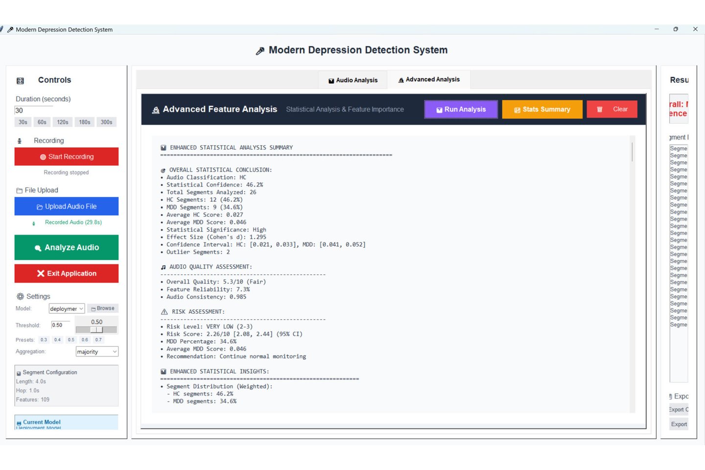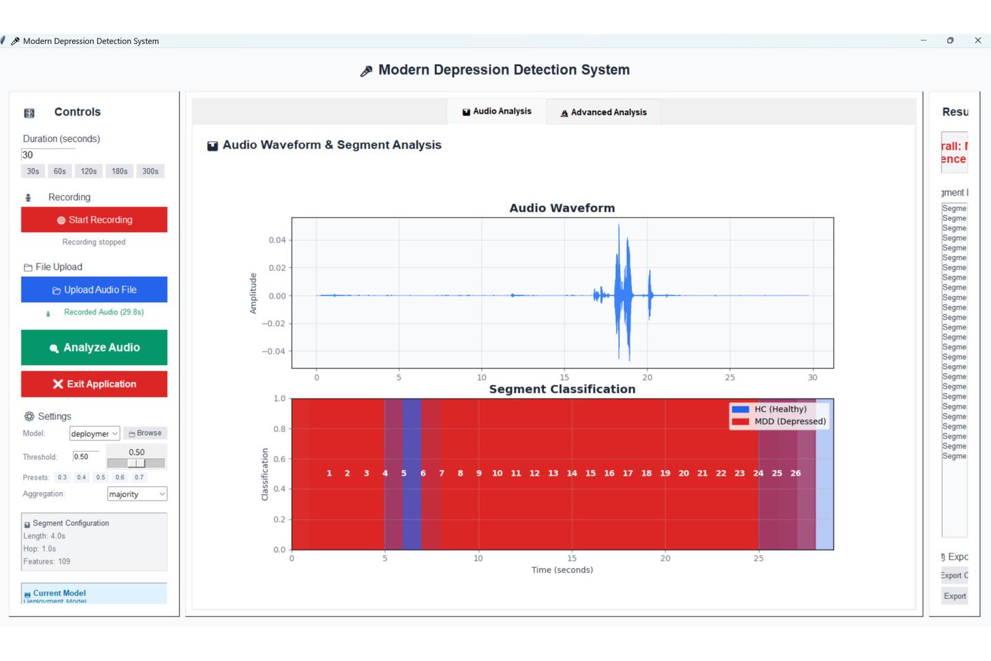 Pavyzdžiui, tyrime nustatyti universalūs biožymenys, tokie kaip sumažėjusi pagrindinio tono dažnio variacija (rodanti monotoniškesnę kalbą), padidėjęs pauzių skaičius ir pakitę tam tikri MFCC koeficientai, apibūdinantys balso spektrines savybes. Šie požymiai iš dalies atspindi psichomotorinį sulėtėjimą ir sumažėjusią balso energiją.