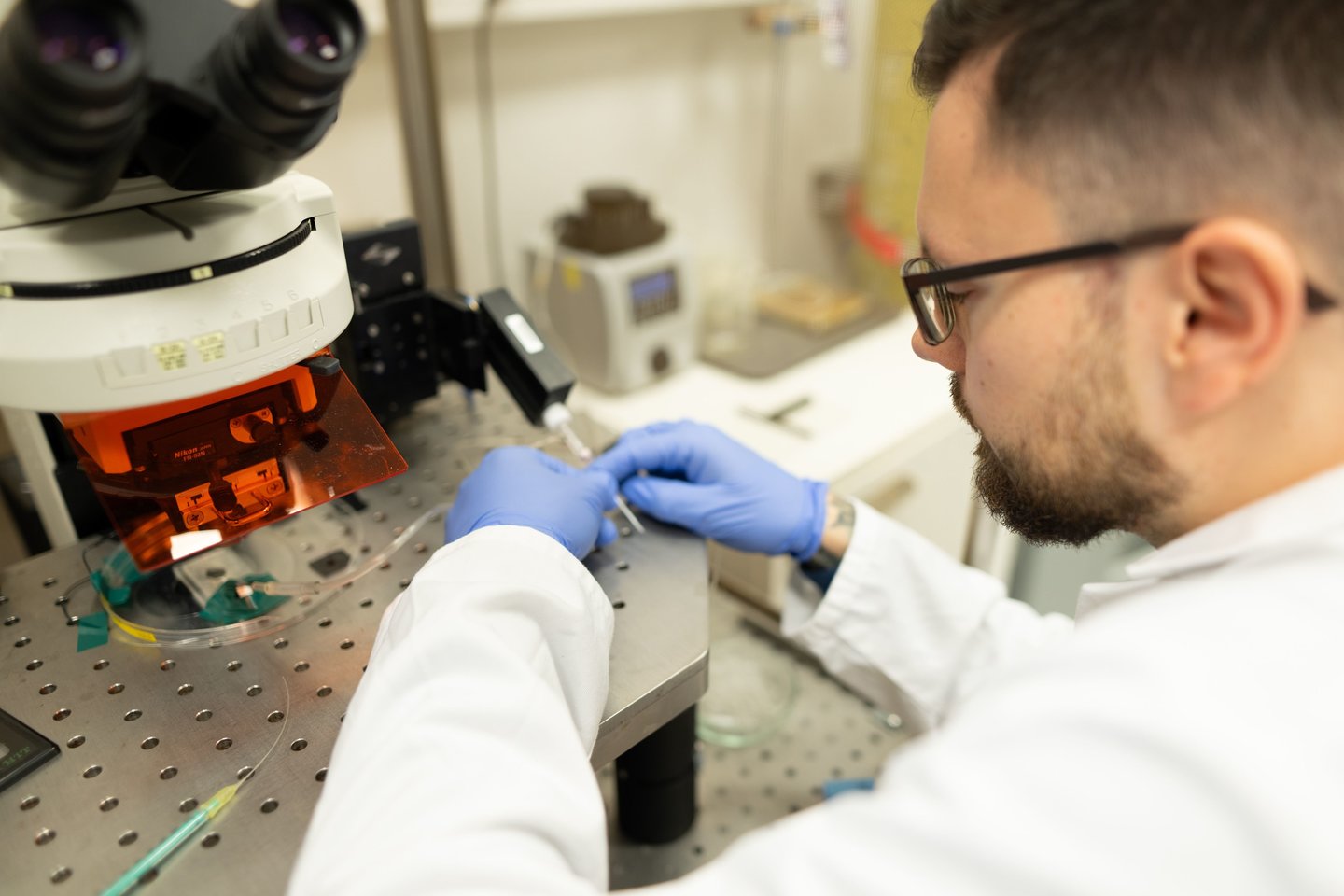 I. Nagula ir G. Valentaitė naudoja pelių modelius, leidžiančius tirti neuronų elektrinę veiklą. Kaip tai atrodo praktikoje? Naudodami itin ploną stiklinę mikropipetę, tyrėjai prisijungia prie pavienių neuronų ir tiesiogiai registruoja jų elektrinius signalus smegenų pjūviuose. Šis metodas suteikia galimybę realiu laiku stebėti neuronų tarpusavio „bendravimą“, o išsami signalų analizė padeda suprasti, kaip ankstyvuoju vystymosi laikotarpiu kinta neuronų aktyvumas.