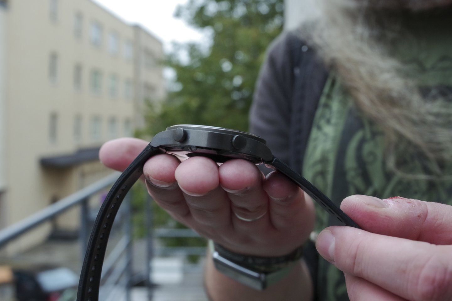 Naujasis „Huawei Watch GT 2 Pro“ visų pirma labiausiai skiriasi išvaizda: nors ekranas yra beveik tokio paties dydžio, kaip „GT 2“ ir mažesnis už „GT 2e“, „Pro“ modelis vizualiai atrodo žymiai masyvesnis. Tai turbūt daugiausia nulemia storas juodas titano korpusas (ankstesniuose modeliuose jis buvo tiesiog nerūdijančio plieno) ir keraminė nugarėlė (ankstesniuose modeliuose nugarėlė buvo plastikinė). Masės prideda ir laikrodžio svoris, dabar išaugęs iki 52 g. Pagaliau jaučiu, kad kažką turiu ant rankos, ir jau vien dėl to mažiau laikrodžiu už visko kliūvu.