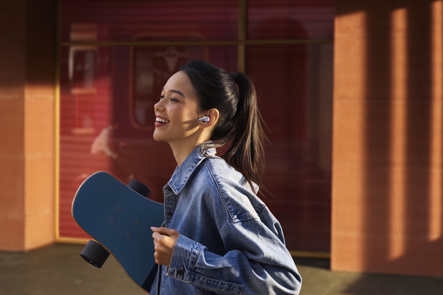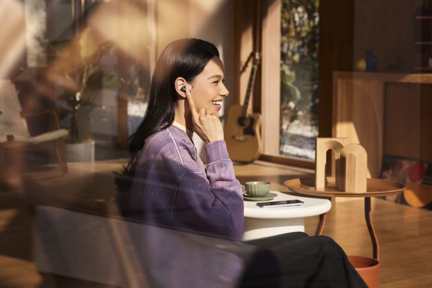 Vietoj „Triukšmo slopinimas“, galima įjungti funkciją „Skaidrumas“. Šiuo atveju į ausines praleidžiami tam tikri aplinkos garsai, kad nebūtumėte visiškai nuo jos atsijungę. Siūlomos trys parinktys: „Įprastas“, „Balso stiprinimas“, „Paryškintas aplinkos garsas“. Įjungus balso stiprinimą mikrofonas praleidžia žmonių balsus.