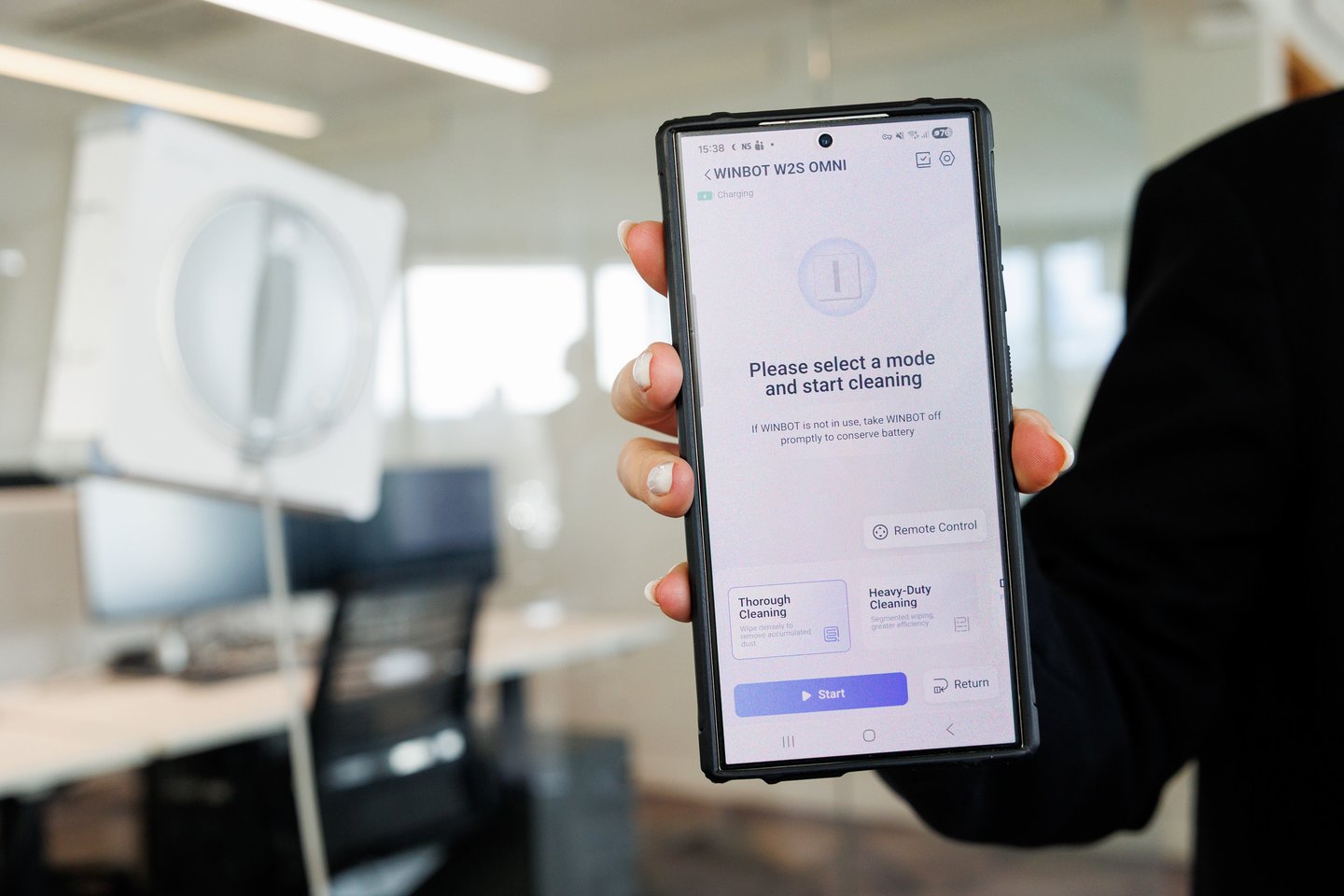 Robotas valdomas programėle telefone. Kuriai, beje, nereikia interneto ryšio (šito reikia tik registracijai), o prie „Winbot“ jungiasi tiesiogiai per „Bluetooth“. Programėlėje yra keli režimai: „Fast“, „Thorough“, „Heavy Duty“, „Deep“ ir „Edge“ . Kiekvienas daugmaž priskirtas ir tam tikrai situacijai – tarkime, kasdieniam valymui, išorės langų valymui, langams taršioje aplinkoje (šalia gatvės ar statybų) ir pan. Tačiau kas ironiškiausia – „Thorough“ buvo mažiausiai thorough (liet. atidus, skupulingas): pasirinkus jį, robotas daugiausia kartų „pasiklysdavo“ ar kažkodėl plaudavo tik pusę lango. Tiesa, tokie atvejai buvo reti – bet jų buvo. Ir jei teisingai pastebėjau dėsningumą – dažniau „pasiklysdavo“ ant didelių langų.
