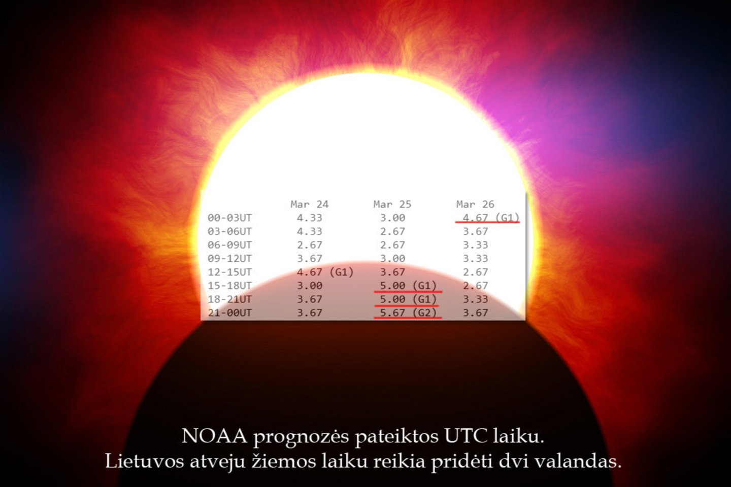 Remiantis NOAA prognozėmis, pirmadienį nuo 14 val iki 17 val. Kp indeksas turėjo siekti 4,67 (tad priartėti prie paties žemiausio lygio geomagnetinės audros), tačiau faktinis Kp 16 val. Lietuvos laiku buvo apie 4 – tad dar tolokai iki geomagnetinės audros statuso.