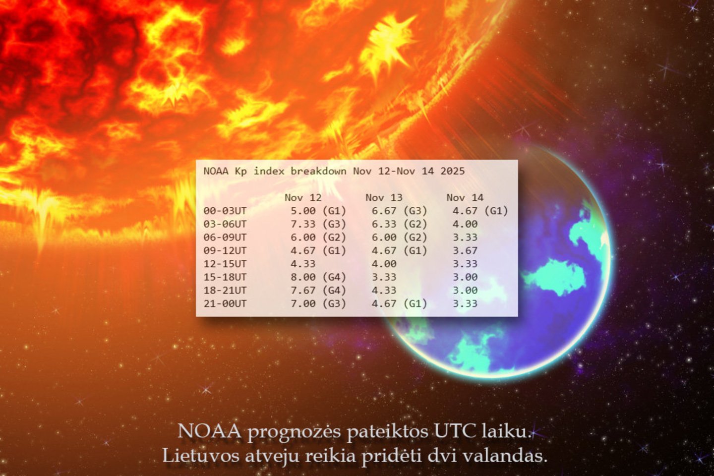 Remiantis JAV nacionaline vandenynų ir atmosferos administracija (NOAA), kuri stebi kosminius orus, nuo penktos iki daugmaž aštuntos valandos ryto (Lietuvos laiku) siautėjo G3 stiprio audra (kuri jau laikoma stipria), ir ji iki 14 val. turėtų palaipsniui nurimti, bet nuo 17 val. gali nutikti antras smūgis – ir toks, kokio Lietuvoje jau seniai nebuvo.
