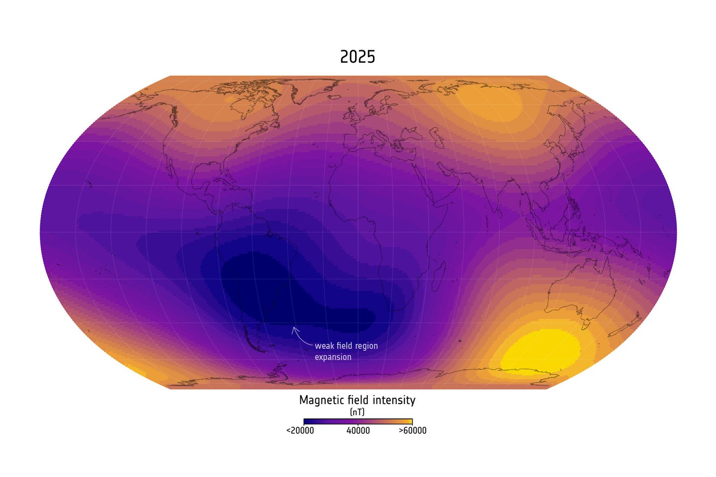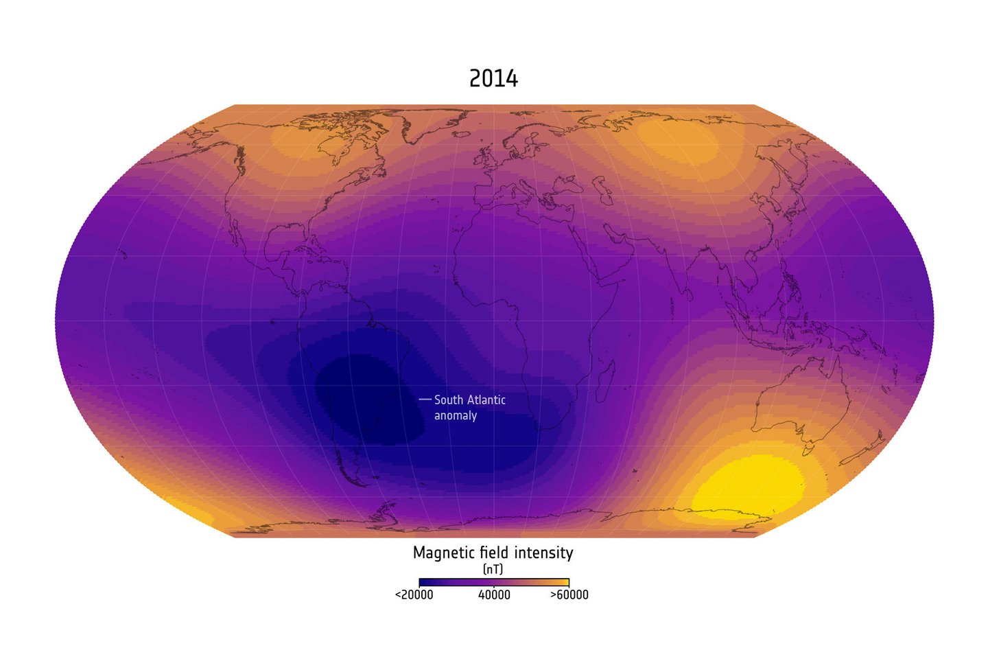 Europos kosmoso agentūros palydovų trio „Swarm“ stebėjimai parodė, kad Žemės ir taip silpnas magnetinis laukas virš Pietų Atlanto vandenyno – regiono, žinomo kaip Pietų Atlanto anomalija (SAA) – silpnėja ir nuo 2014 m. išsiplėtė iki ploto, kuris yra pusės Europos kontinento dydžio. Tuo pačiu metu matavimai rodo, kad regionas virš Kanados, kuriame laukas yra ypač stiprus, susitraukė – o kitas stiprus lauko regionas Sibire išsiplėtė.