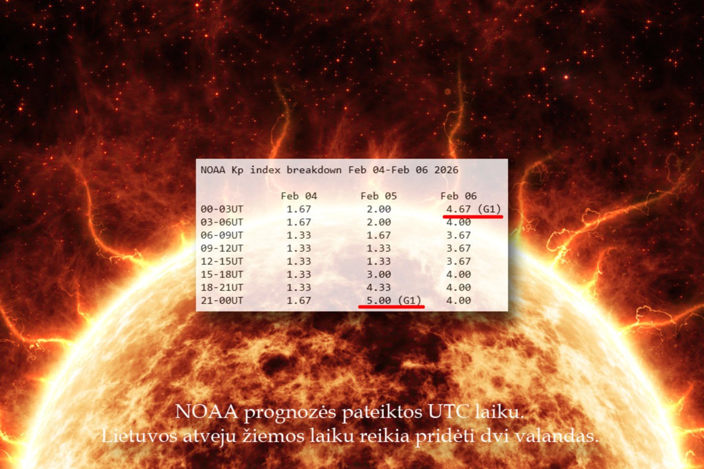 Kaip rodo NOAA duomenys, geomagnetinė audra turėtų prasidėti ketvirtadienį 23 val. Lietuvos laiku, o baigtis anksti ryte, apie 5 val.