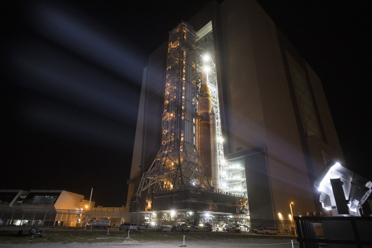 Didžiulė oranžinės ir baltos spalvos „Space Launch System“ (SLS) raketa ir „Orion“ erdvėlaivis turėjo būti lėtai išvežti iš Floridoje įsikūrusio Kenedžio kosminių skrydžių centro surinkimo pastato ir labai atsargiai perkelti į paleidimo aikštelę 39B, esančią už 6,5 km.
