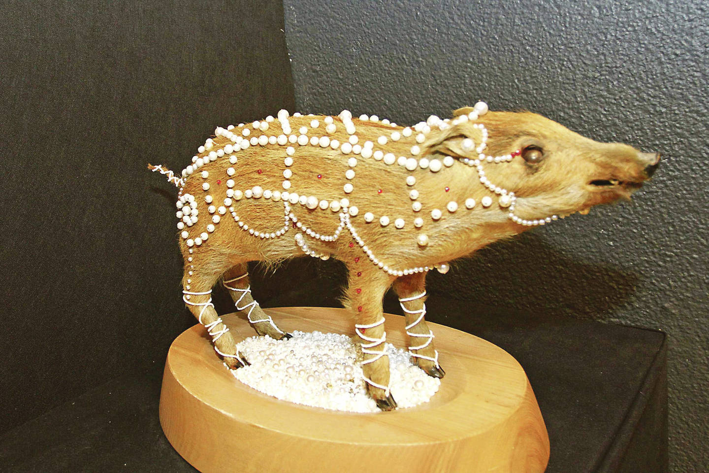 Skulptorius Danielius Sodeika su dukra Birute Sodeikaite pristatė darbą „Dovana“ – paršelio iškamšą, papuoštą perlais.