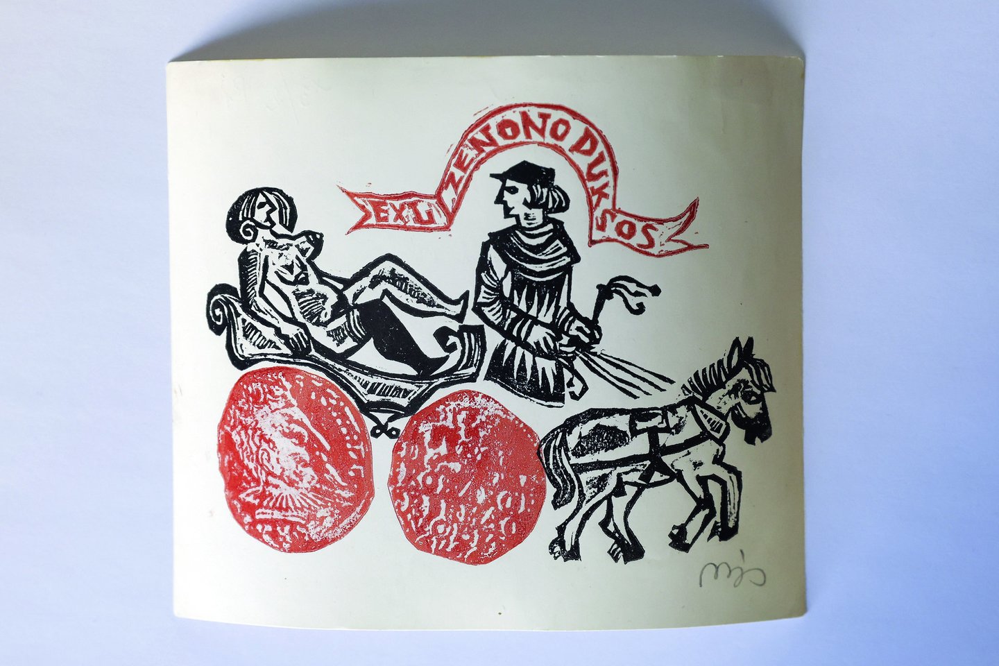 Ekslibrise matome jam 1951 m. draugų padovanotą medalio atvaizdą, kuris, matyt, buvo pagamintas graikiškos antikinės monetos – dekadrachmos, kaldintos Sirakūzuose (Sicilija), pagrindu, nes jame pavaizduotas dviratis kovos vežimas, pakinkytas keturiais arkliais, ir virš jo pergalės deivė Nikė, rankose laikanti laurų vainiką. Jo autorius nežinomas.