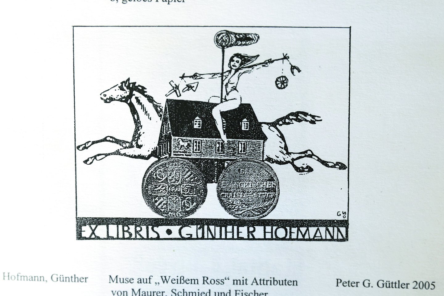 Savo kompozicija iš kitų ekslibrisų išsiskiria monetų rinkėjo Guntherio Hofmanno iš Vokietijos knygos ženklas, kurį jam 2005 m. sukūrė Peteris Guttleris. Šioje miniatiūroje pavaizduota mūza ant balto žirgo su mūrininko, kalvio ir žvejo atributika. Šiame knygos ženkle taip pat parodytas Vokietijos (Frankonijos regiono) 1693 m. guldeno (2/3 talerio) aversas ir reversas.