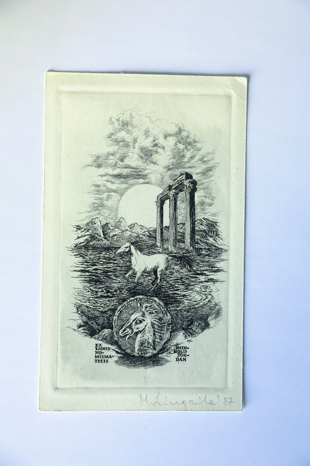 Arklio motyvas ekslibrise. Lietuvos grafiko Mariaus Liugailos (1953–2013) ekslibrise, kurį jis 1987 m. sukūrė Vokietijos Federacinės Respublikos numizmatui Reinholdui Jordanui, matome antikinės Graikijos monetą su arklio galva ir stovinčiu arkliu.