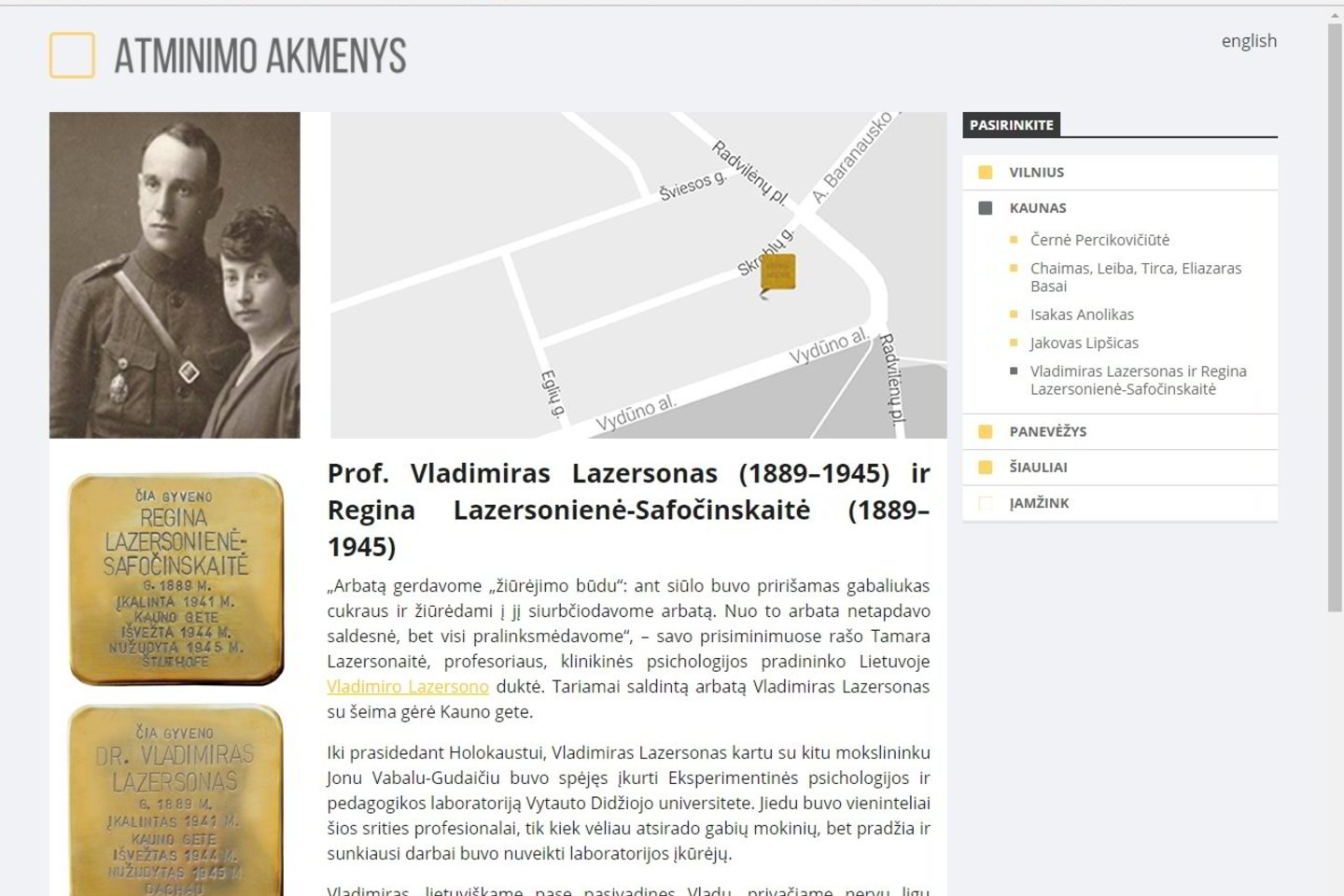 „Puslapyje atminimoakmenys.lt skaitytojai ras ir daugiau asmeniškų, žmogiškai papasakotų istorijų apie žydus bei romus, kuriems Lietuvoje įrengti Atminimo akmenys. Dalį istorijų skaitytojai galės ne tik perskaityti, bet ir pamatyti – video įrašuose pirmuoju asmeniu, lyg patys būtų tie, apie kuriuos kalba, atmenamų žmonių istorijas pasakoja profesiniais, tautiniais ar giminystės ryšiais su Holokausto metu su nužudytu asmeniu susiję žmonės“, – sakė Lietuvos žmogaus teisių centro, sukūrusio puslapį, atstovė Jūratė Juškaitė.