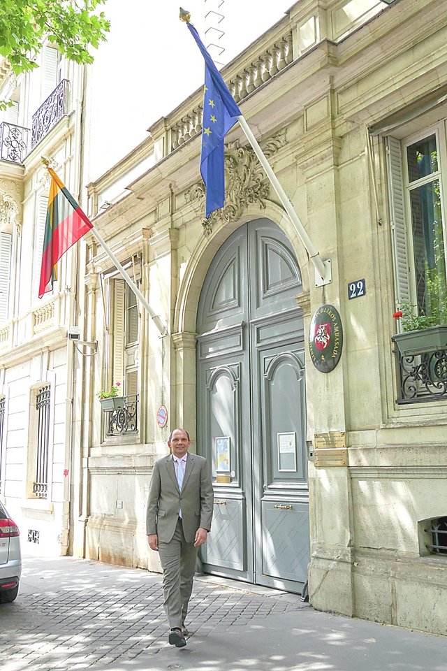 Lietuvos ambasadorius Prancūzijoje Nerijus Aleksiejūnas iš dabartinės mūsų šalies rezidencijos tame pat 17-ajame Paryžiaus rajone istorinį ir praeitį dar menančių simbolių turintį buvusį pasiuntinybės pastatą Generolo Katru (Catroux) aikštėje pėsčiomis pasiekia per 5 minutes.