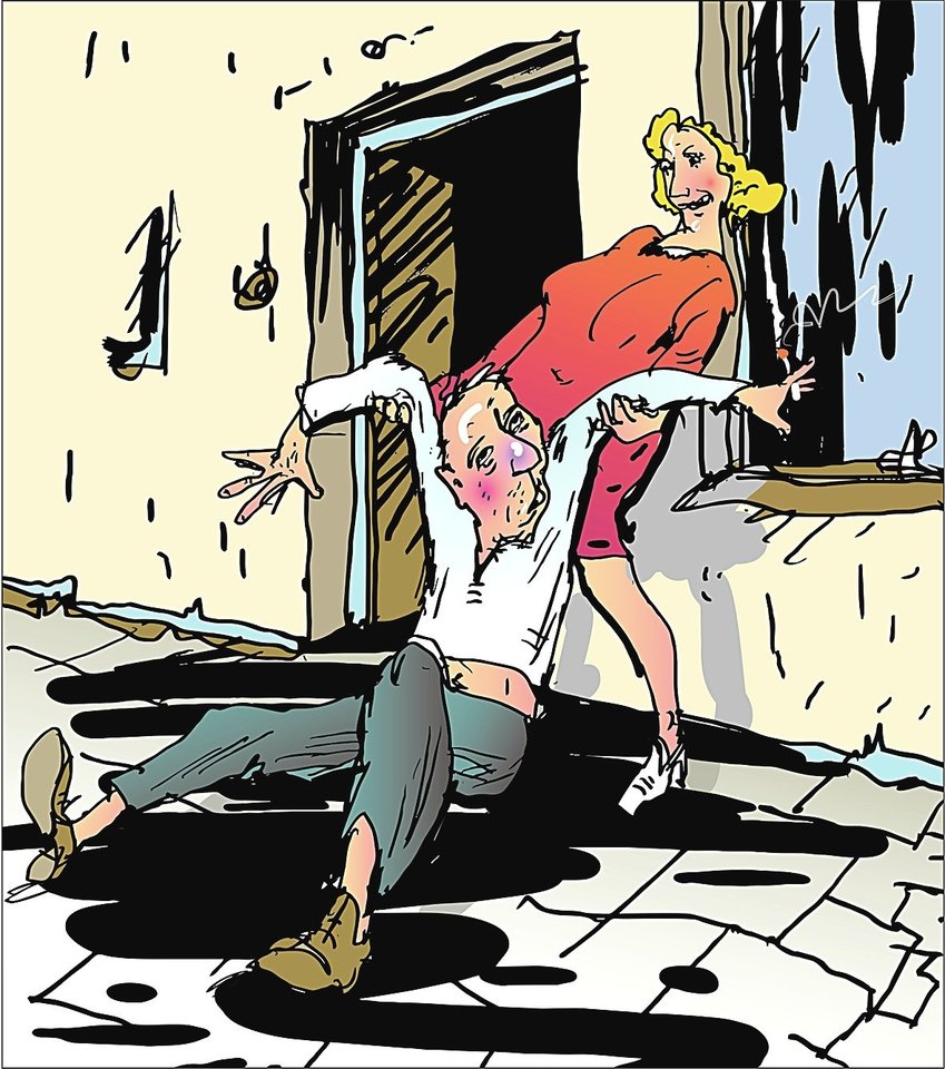 Prišokus žmona stveria senjorą leitenantą už čiuprynos ir nutempia trobon.