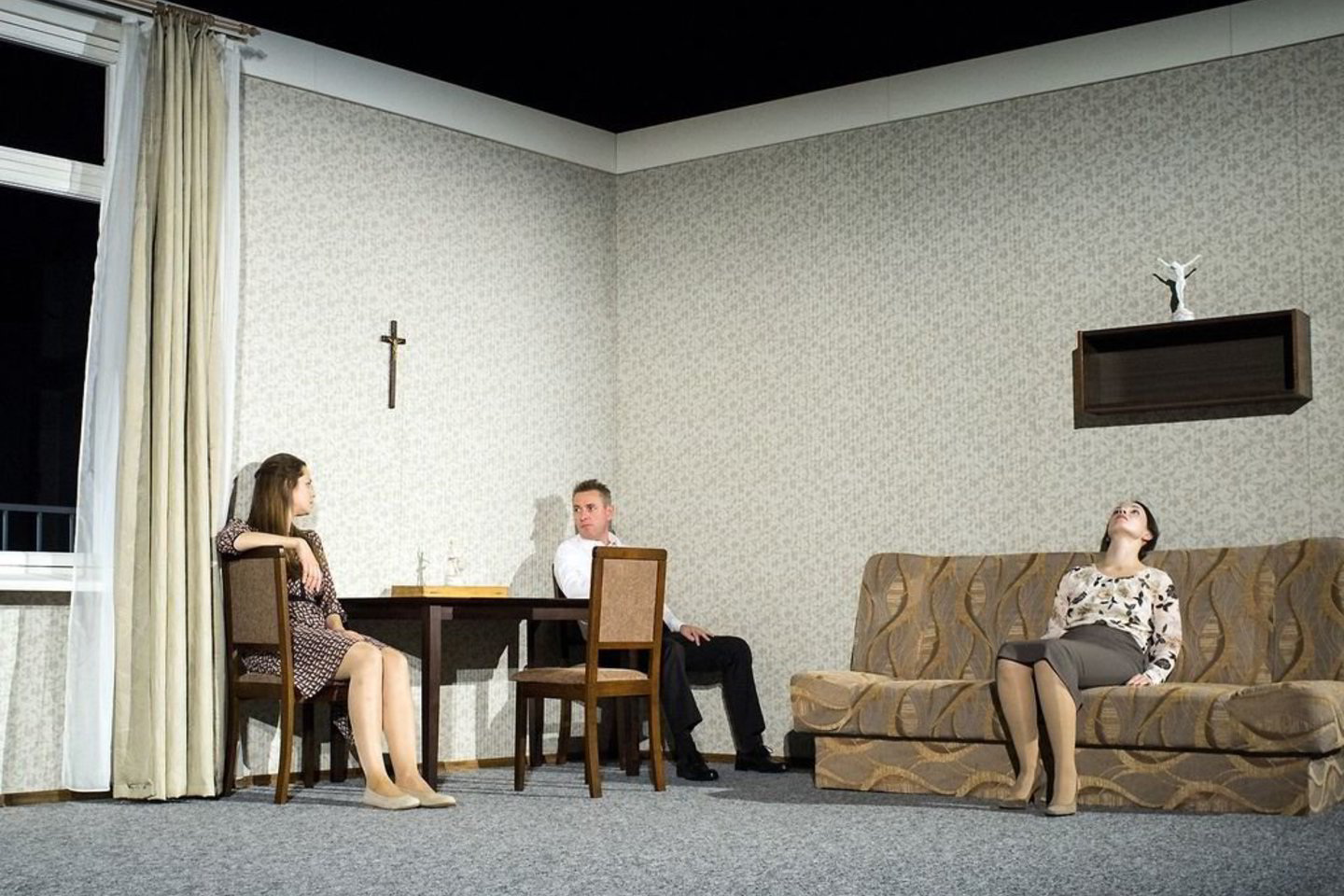 Scena neapkrauta buitinėmis detalėmis. Kambaryje – tik „praktiškos spalvos“ kiliminė danga, stalas, kėdės, lentyna, televizorius, durys ir išėjimas į balkoną. Ši erdvė – kaip akivaras be spalvų ir vilties.
