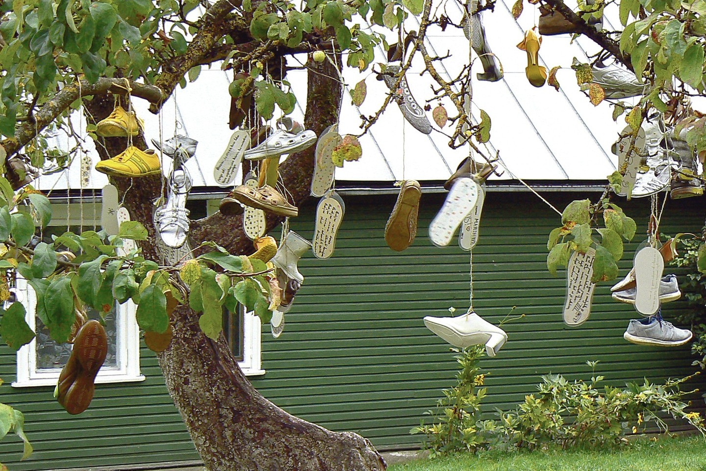 Ant medžių šakų buvo pakabinta dešimtys įvairaus dydžio batų – nuo sportinių batelių iki aukštakulnių.
