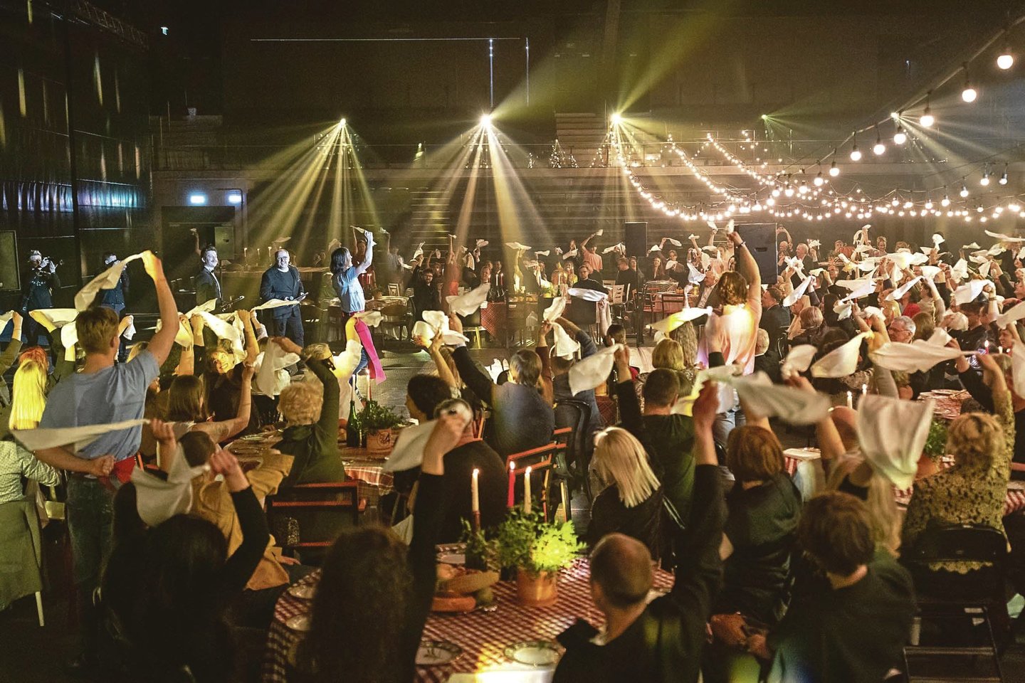 Vėliau padavėjai surengė ir varžybas. Svečius suskirstę į tris komandas ragino juos kuo aktyviau virš galvų sukti baltas servetėles.
