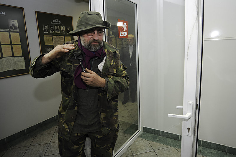 Po to paragavo užkandžių, karingai papozavo portalo lrytas.lt fotografui ir pamėgino kalbinti partijos vadovus. Bet neradęs bendros kalbos, keistuolis patraukė savo keliais – į sostinės Senamiesčio gatves.
