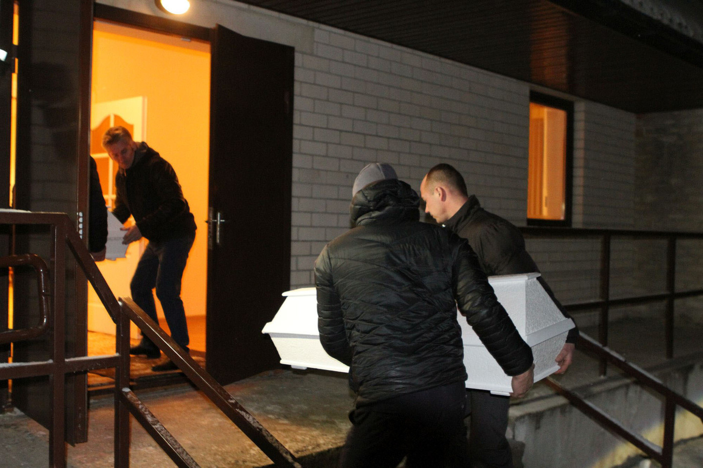 Du mažus baltus karstelius vieną po kito laidojimo įmonės darbuotojai į bendruomenės namus įnešė apie 19 val. Taip pat atvežti ir gedulingi vainikai.