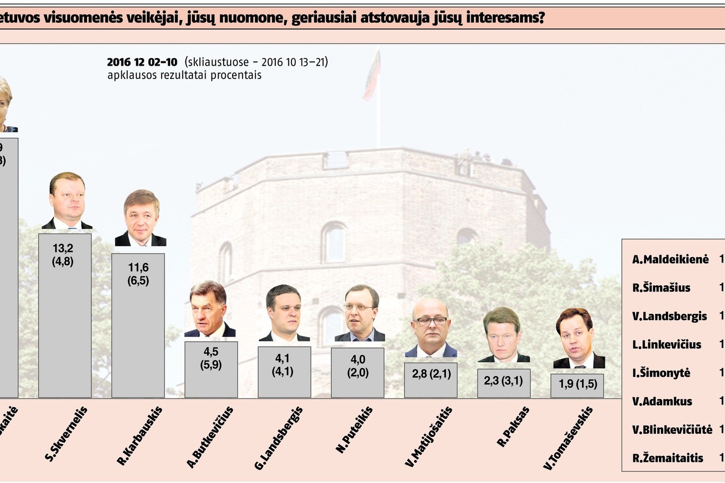 Tiesa, kol kas daugiau žmonių mano, jog geriausiai jų interesams tebeatstovauja prezidentė. Šioje lentelėje antrąją vietą užima premjeras, o trečiąją – „valstiečių“ lyderis Ramūnas Karbauskis.