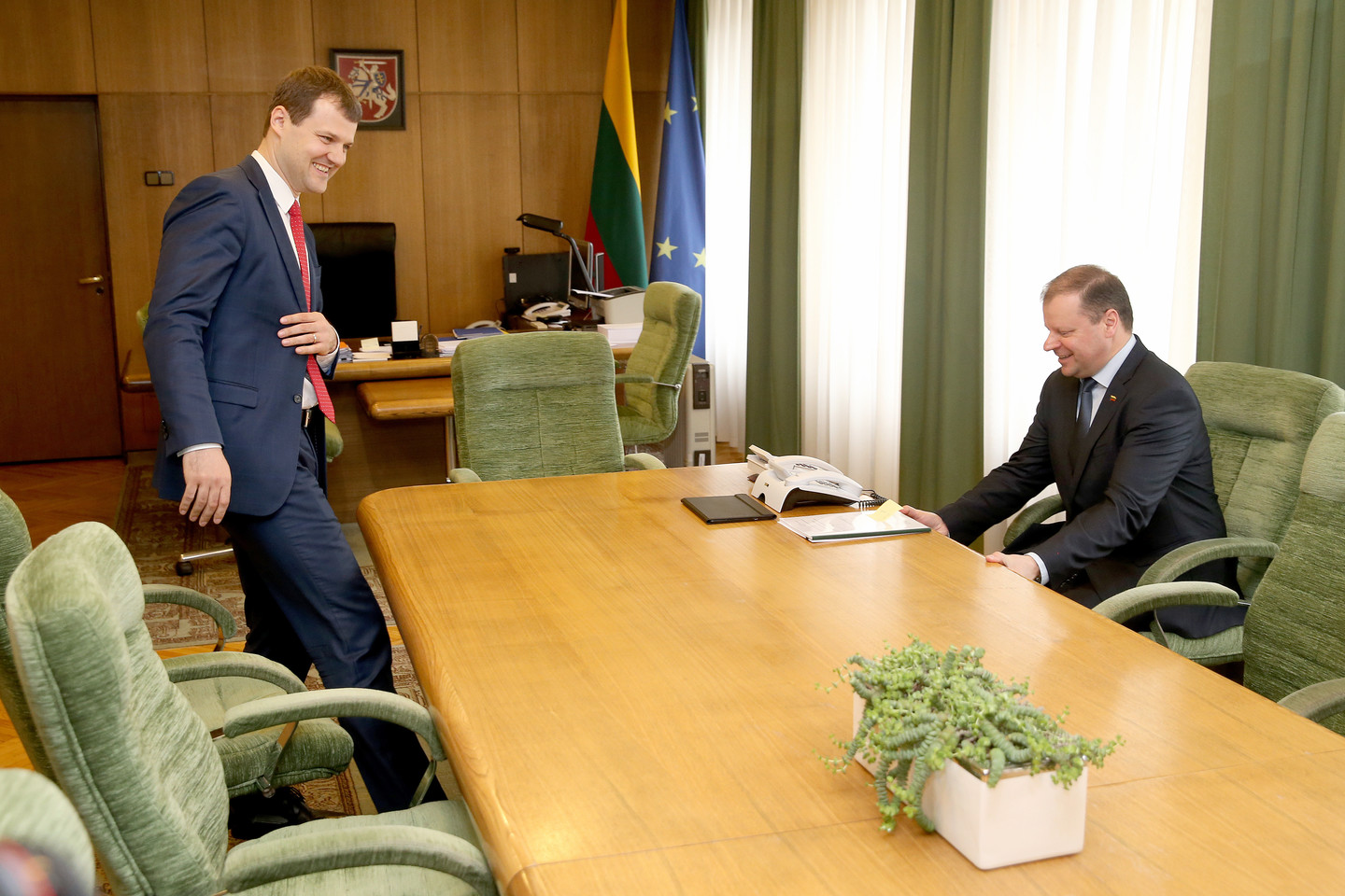 Premjeras S.Skvernelius susitikimus su frakcijų lyderiais pradėjo nuo opozicijoje esančių konservatorių lyderio Gabrieliaus Landsbergio. Tačiau paklaustas, ar būtent to išsigandę socialdemokratai pradėjo kalbėti apie susitarimą, premjeras teigia, kad jiems nėra, ko bijoti.