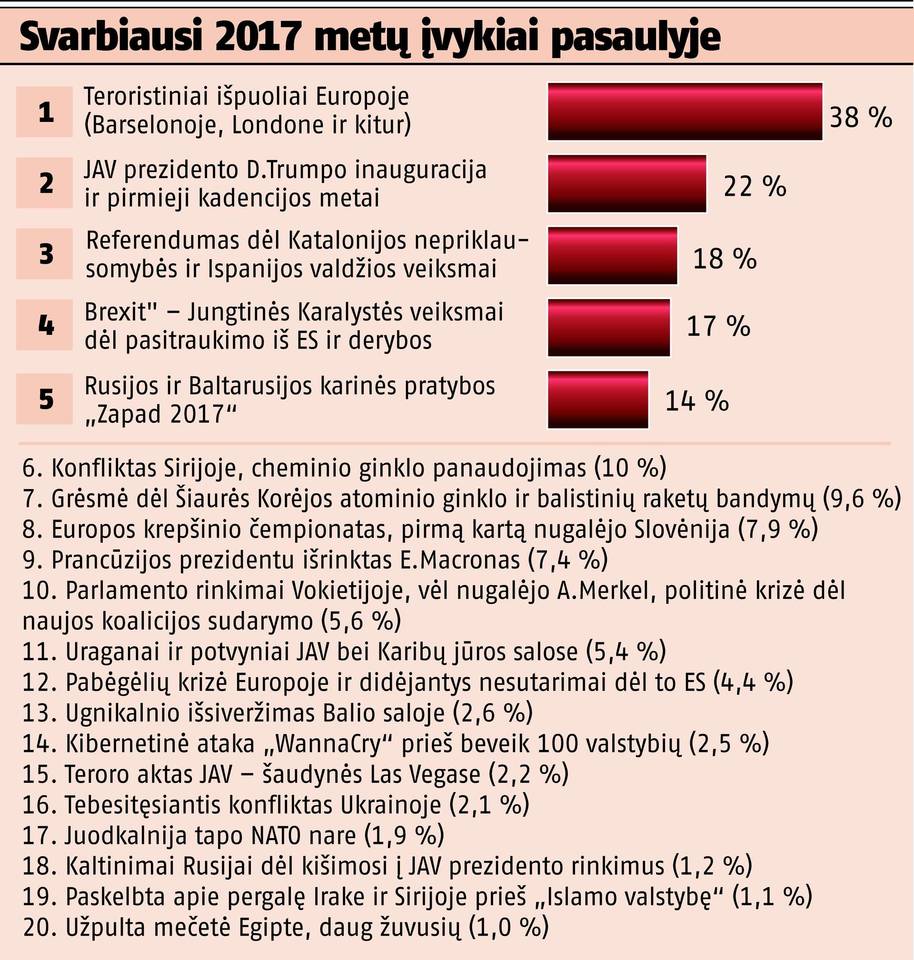 Net keturių iš dešimties lietuvių manymu, svarbiausiais 2017-ųjų įvykiais pasaulyje reikėtų laikyti teroro išpuolius įvairiuose Europos miestuose.