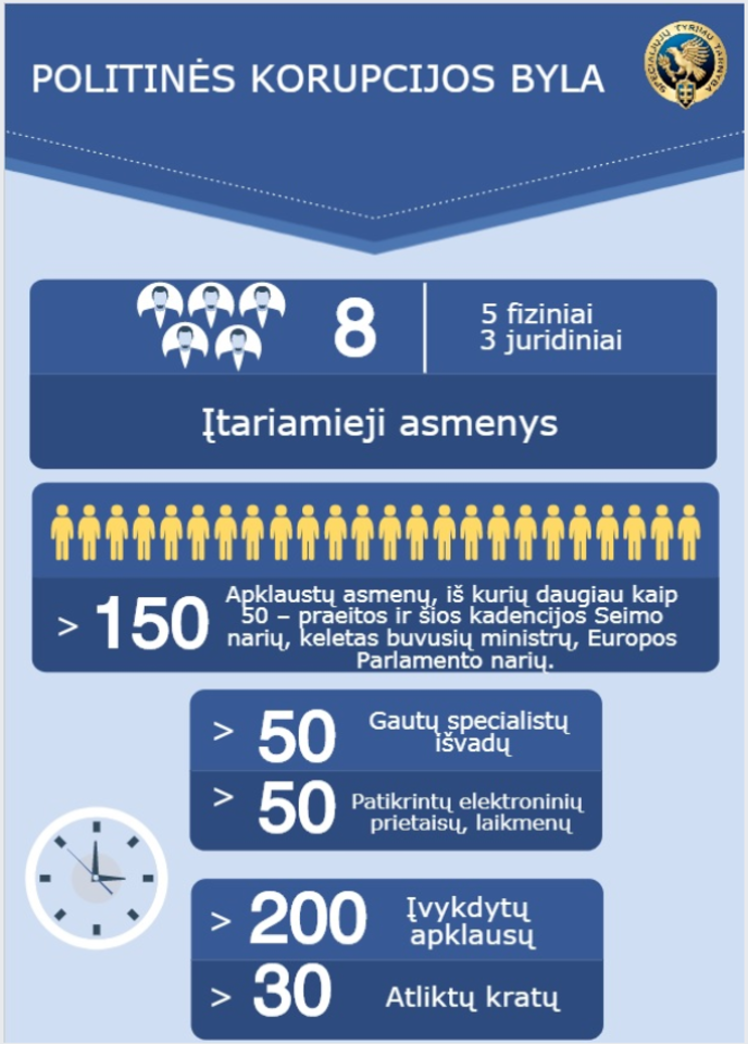 STT Vilniaus valdybos Ikiteisminio tyrimo skyriaus viršininkas Ramūnas Lukošius teigė, kad bylą sudaro daugiau nei 21 tūkst. dokumentų. „Tai byla, kuri parodo, kad verslo atstovai, siekdami sau palankių sprendimą, dėjo visas pastangas per savo atstovą, kad būtų papirkti politikai, būtų paveikti jų sprendimai.“