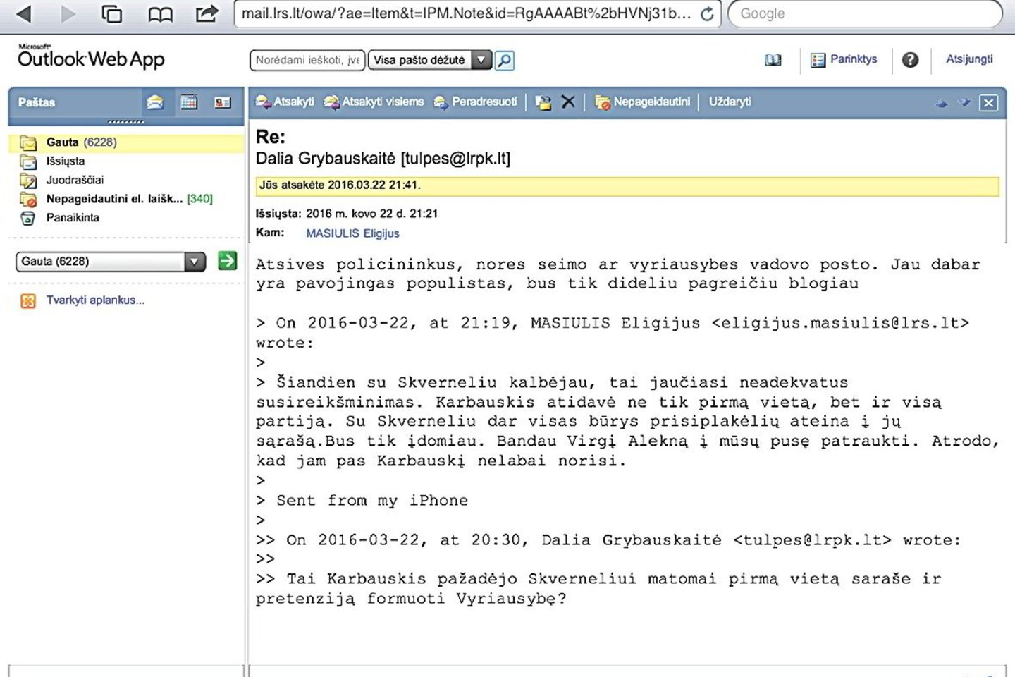 Kaip skelbė „Lietuvos rytas“, D.Grybauskaitė ir E.Masiulis laiškuose aptarė S.Skvernelio sprendimą į Seimą kandidatuoti su valstiečiais: „Tai Karbauskis pažadėjo Skverneliui matomai pirmą vietą sąraše ir pretenziją formuoti Vyriausybę?“