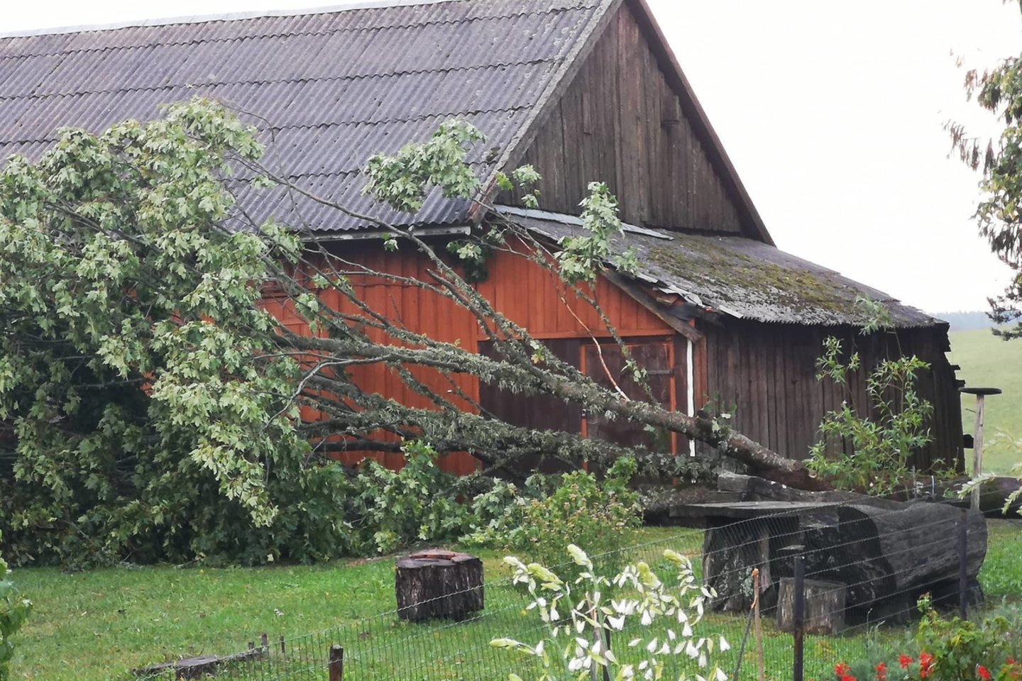 Portalo gismeteo.lt feisbuko paskyroje skelbiama, kad stipri audra nusiaubė ir Telšius – nuplėšti namų stogai, nuvirtę medžiai.