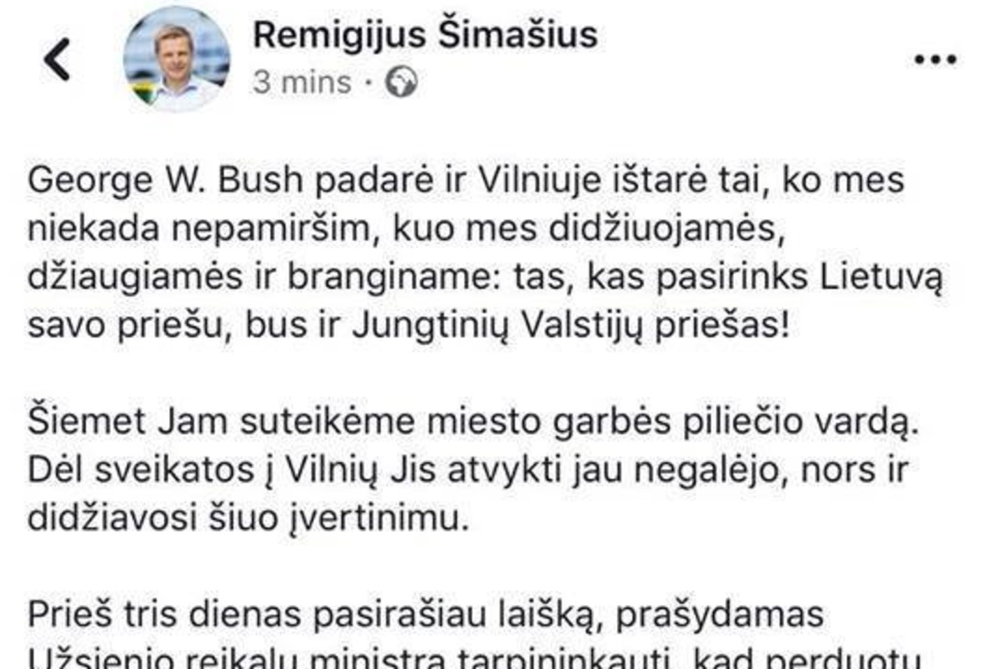 Jautrioje žinutėje jis priminė, kad G.W.Bushui suteiktas Vilniaus garbės piliečio vardas. Panašu, kad meras supainiojo tėvą ir sūnų, mat pasaulis gedi G.H.W. Busho vyresniojo.
