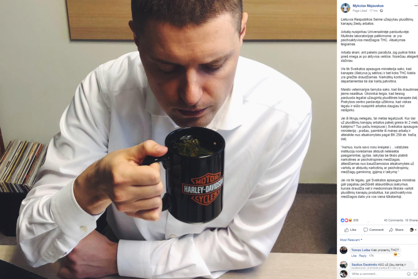 Jei iš tikrųjų nelegalu, tai metas legalizuoti. Kur dar už pluoštinių kanapių arbatos pakelį gresia iki 2 metų kalėjimo? Tuo pačiu kreipiuosi į Sveikatos apsaugos ministeriją – prašau, paimkite iš manęs arbatą ir atleiskite nuo atsakomybės pagal BK 259 str. trečią dalį“, – rašė konservatorius.